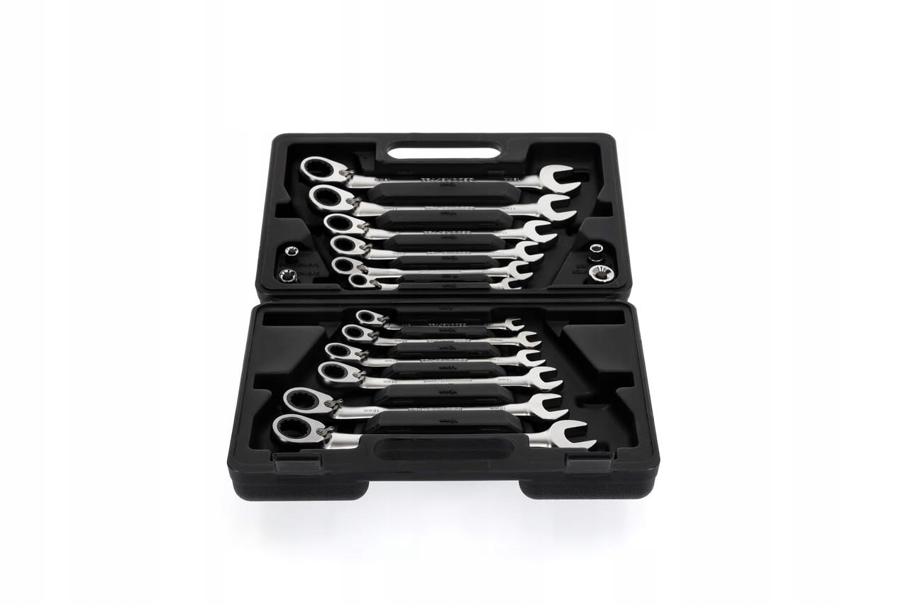 WYGODNE UŻYTKOWANIE: Zestaw obejmuje klucze nasadowe z otworem o kącie 15°, kątem powrotu 5° oraz przełączaną nasadką; Dodatkowo zawiera adaptery kwadratowe oraz adapter bitowy