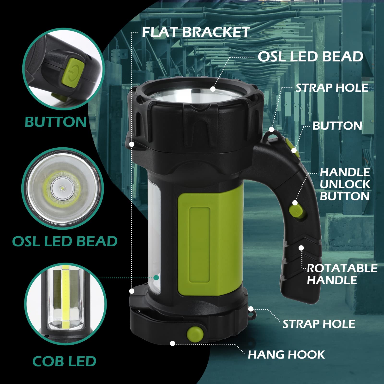 1. {Wysoka Jasność}: Przenośny reflektor boczny z światłem COB jest wyposażony w 6 trybów oświetlenia. W tym 3 tryby LED-spot i 3 tryby COB: Wysoka Jasność LED Spot Light, Niska Jasność LED Spot Light, Stroboskop; COB-Wysoka Jasność, COB-Niska Jasność, COB-Flash. Naciśnij i przytrzymaj przycisk, aby włączyć światło COB.