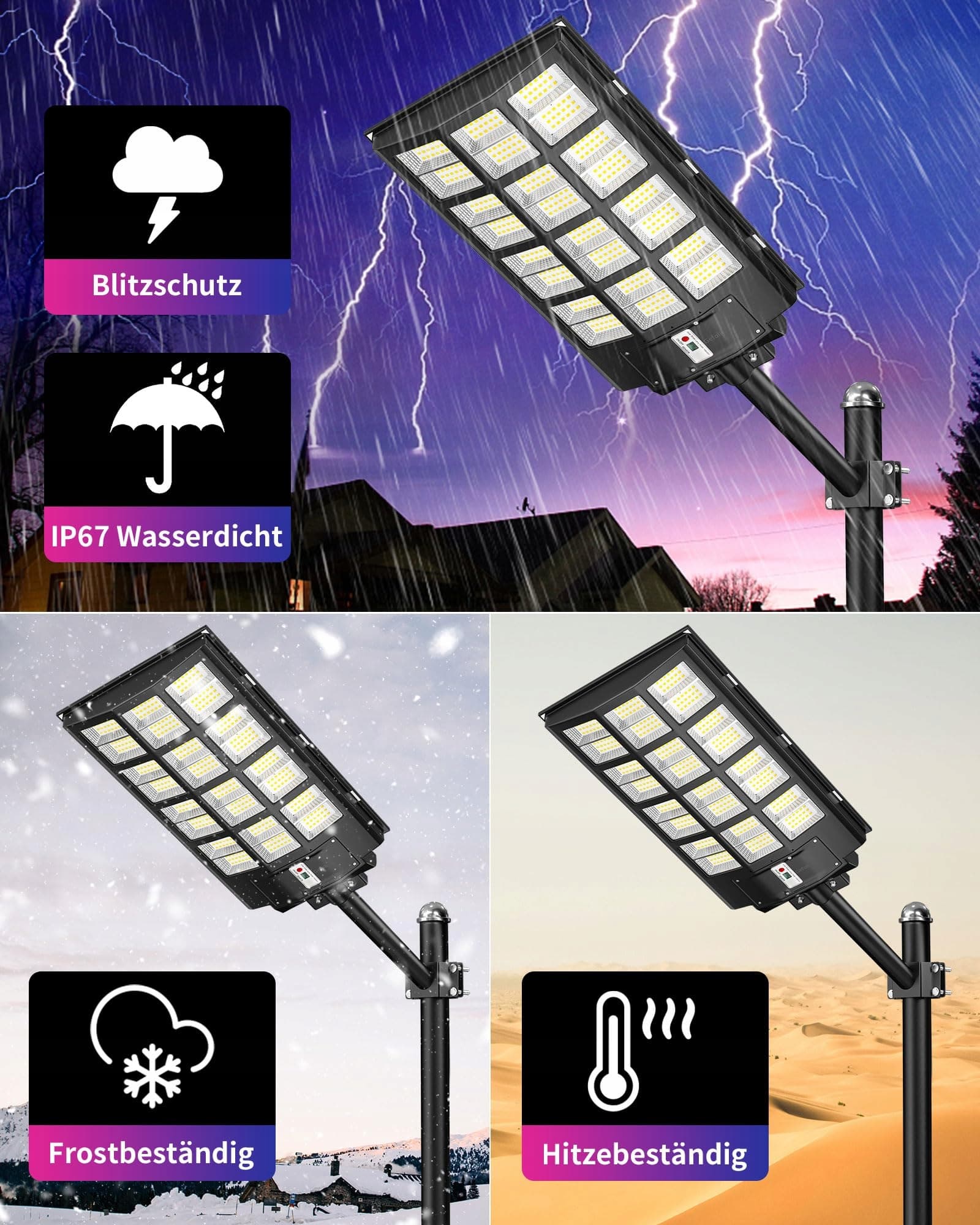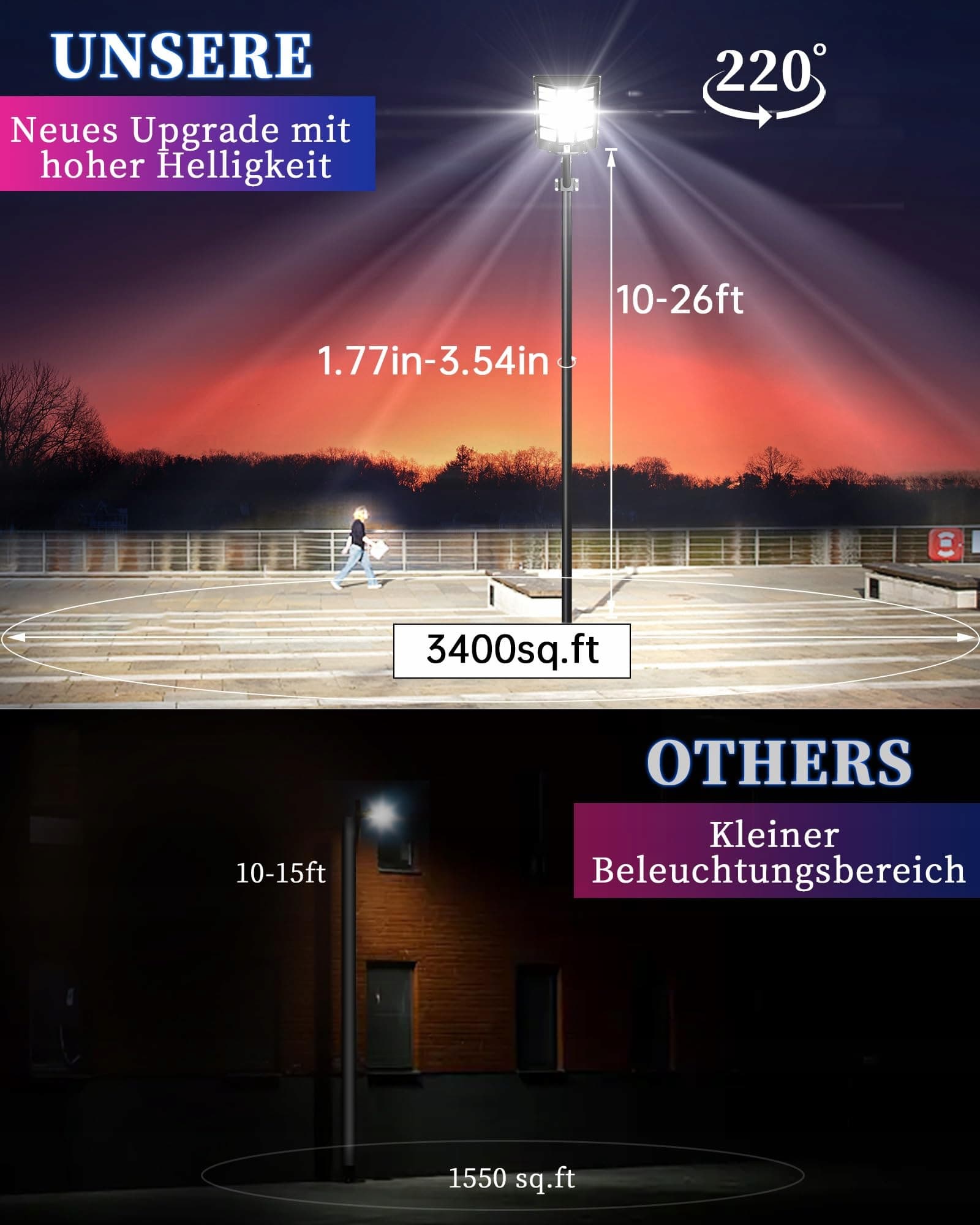 【ULTRASZEROKI KĄT OŚWIETLENIA】Ulepszona latarnia uliczna z pilotem zdalnego sterowania wyposażona w ultraszerokokątne oświetlenie, które w porównaniu do zwykłych latarni ulicznych oferuje większy obszar oświetlenia i jaśniejsze światło. Obszar oświetlenia do 3200 m², eliminuje martwe pola. Dbamy o bezpieczeństwo Twoje i Twojej rodziny