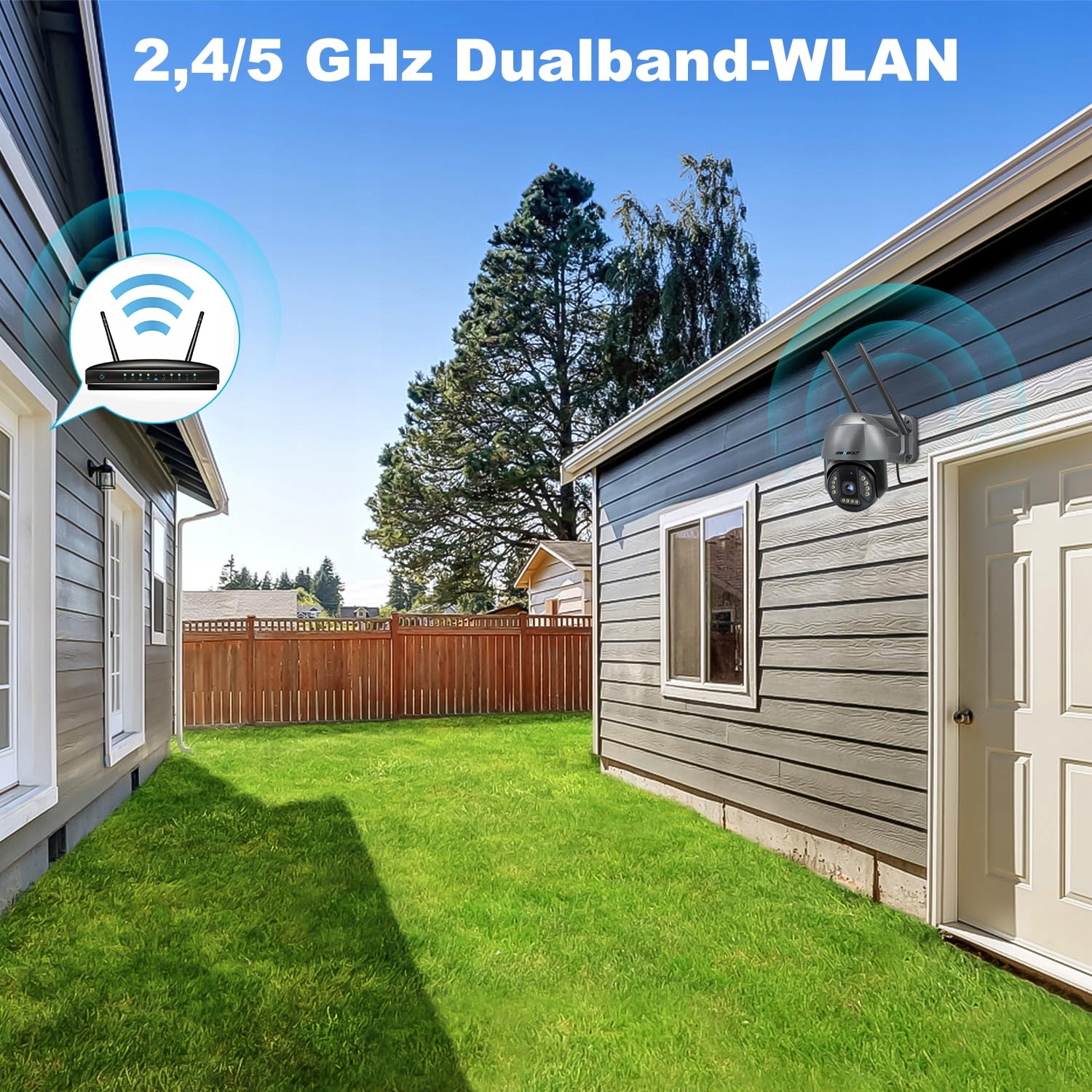 【WiFi dwupasmowe 2,4/5 GHz, automatyczne śledzenie】 Kamera dwupasmowa obsługuje WiFi 2,4GHz i 5GHz, zapewniając szybkie i stabilne połączenie WLAN. Ta zewnętrzna kamera monitoringu oferuje obrót poziomy 355° i pionowy 90° oraz 4-krotny zoom cyfrowy. Gdy jesteś przy kamerze Outdoor, automatycznie śledzi ruchy ludzi dla większej szczegółowości.