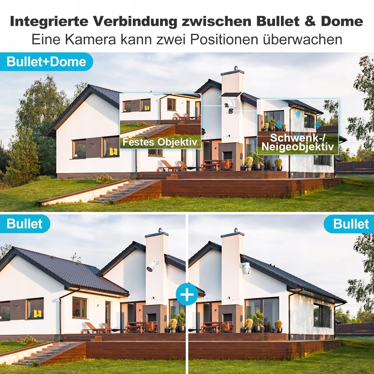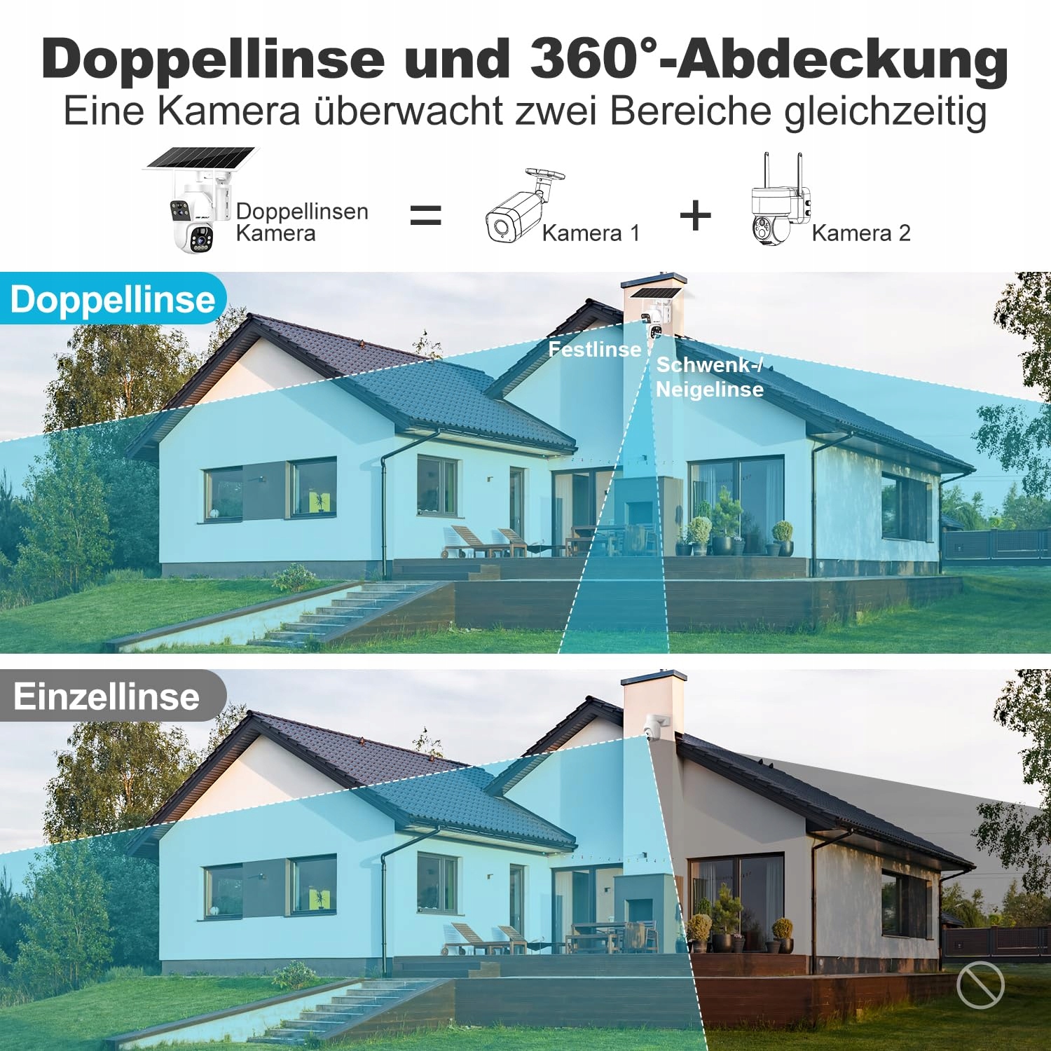 🌞 [Podwójny obiektyw i podwójny ekran] Bezprzewodowa kamera do monitoringu na zewnątrz posiada podwójny obiektyw dla pełnego pokrycia, bez martwych punktów. Górna kamera typu bullet jest zamocowana w jednym miejscu, aby umożliwić szerokokątną obronę. Kamera PT-Dome może obracać się o 355°/90°. Dzięki temu można jednocześnie obserwować jeden lub dwa różne obszary za pomocą jednej kamery