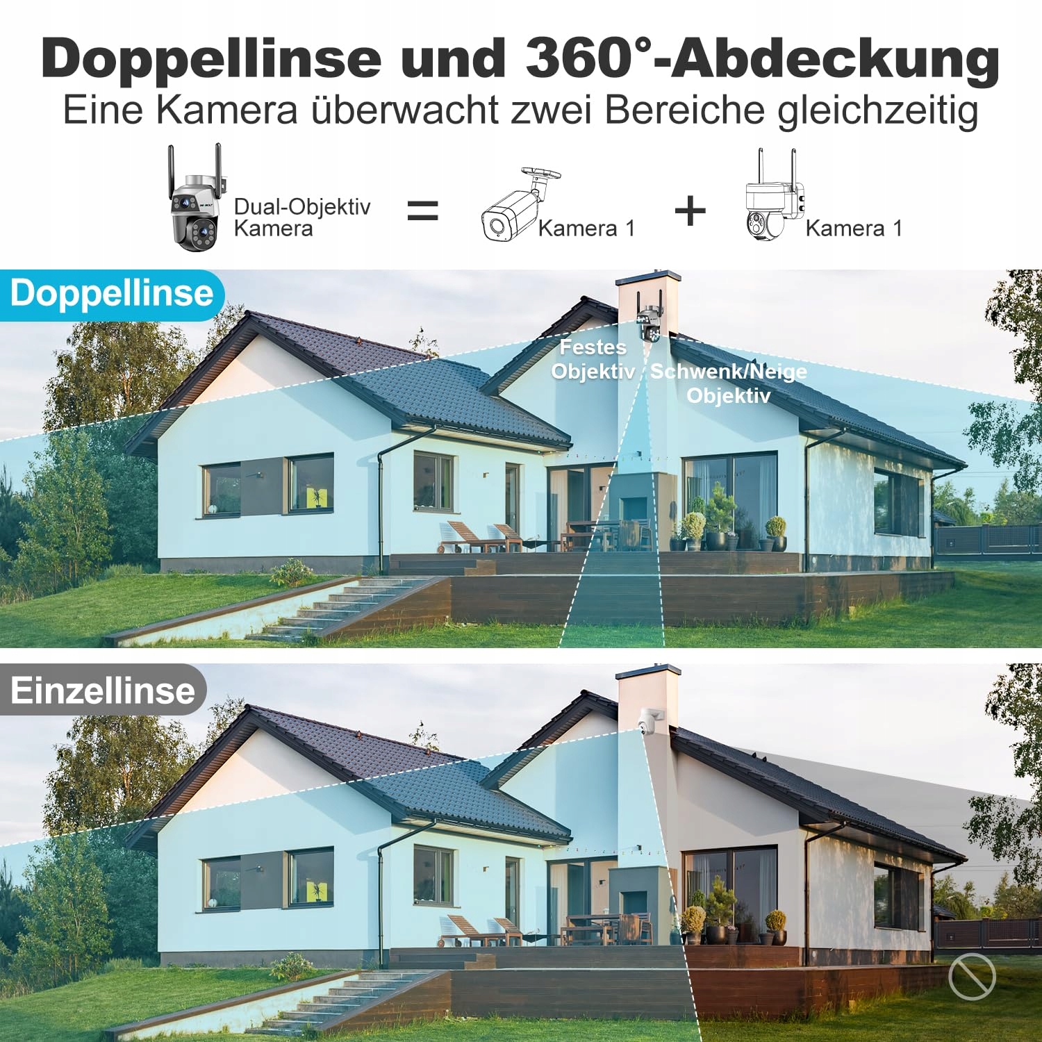 【Podwójny obiektyw i widok 360°】Kamera monitorująca CCTV na zewnątrz posiada podwójny obiektyw dla pełnego pokrycia, bez martwych punktów. Górna kamera typu bullet jest zamocowana na stałe, aby zapewnić szeroki kąt ochrony. Dolna kamera kopułkowa może obracać się poziomo o 355° i pionowo o 90°. Dzięki temu jedną kamerą można jednocześnie monitorować ten sam lub dwa różne obszary.
