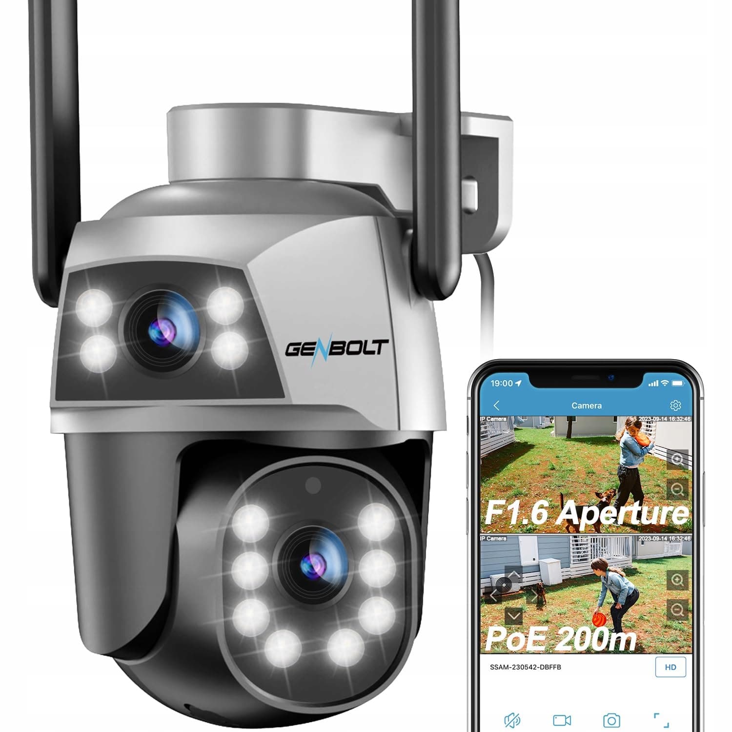 GENBOLT WLAN Kamera monitorująca na zewnątrz z PoE, kamera monitorująca z podwójnym obiektywem na zewnątrz IP CCTV z kolorowym trybem nocnym, automatyczne śledzenie, wykrywanie humanoidalne, kamera z funkcją obracania i pochylania oraz reflektorem