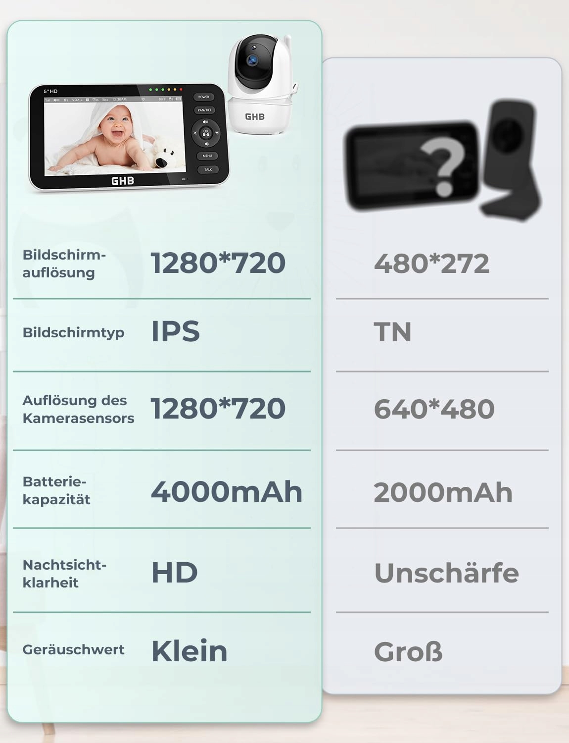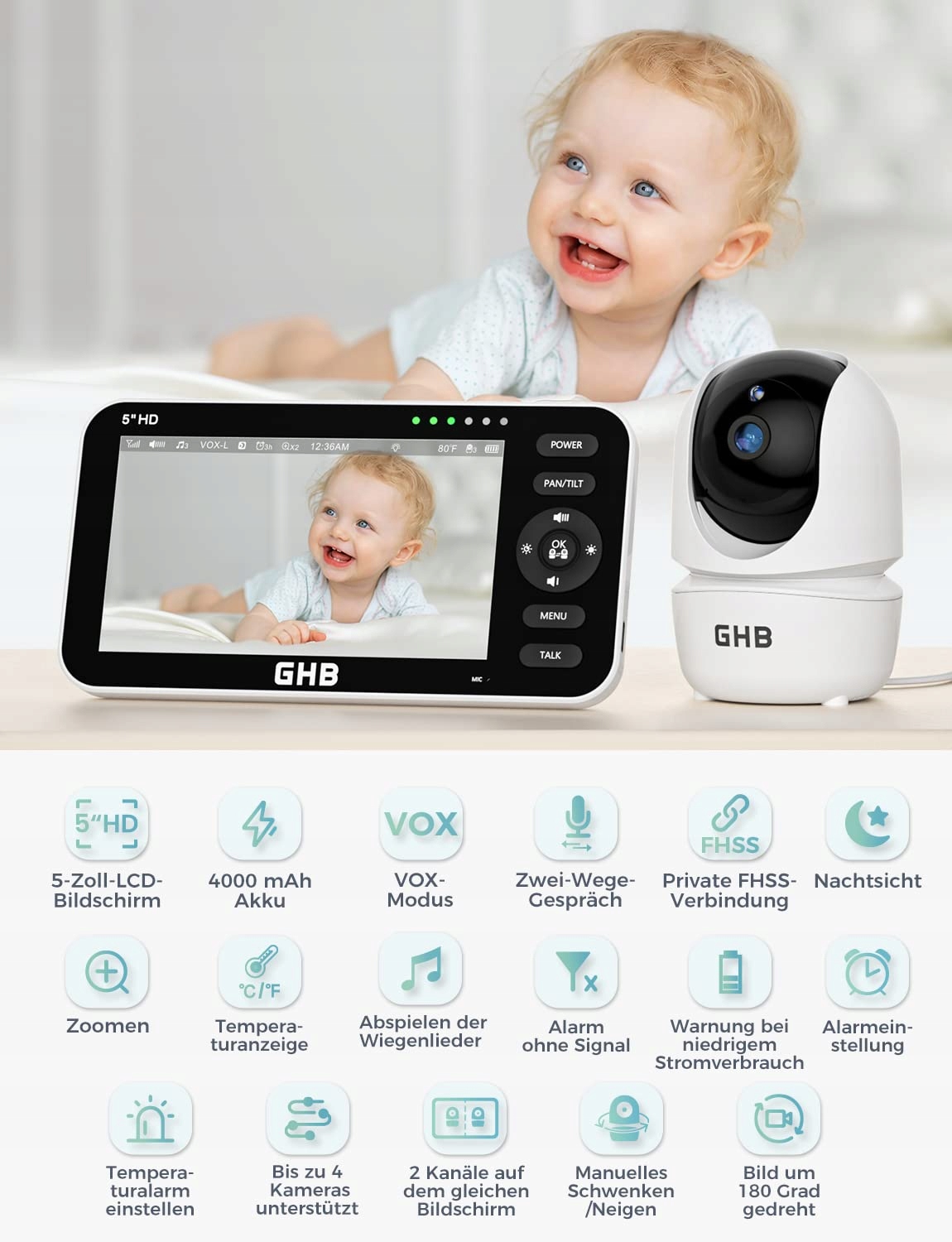 GHB Niania Elektroniczna Kamera 5 Cali HD VOX Tryb Dwukierunkowy | Premium Supply