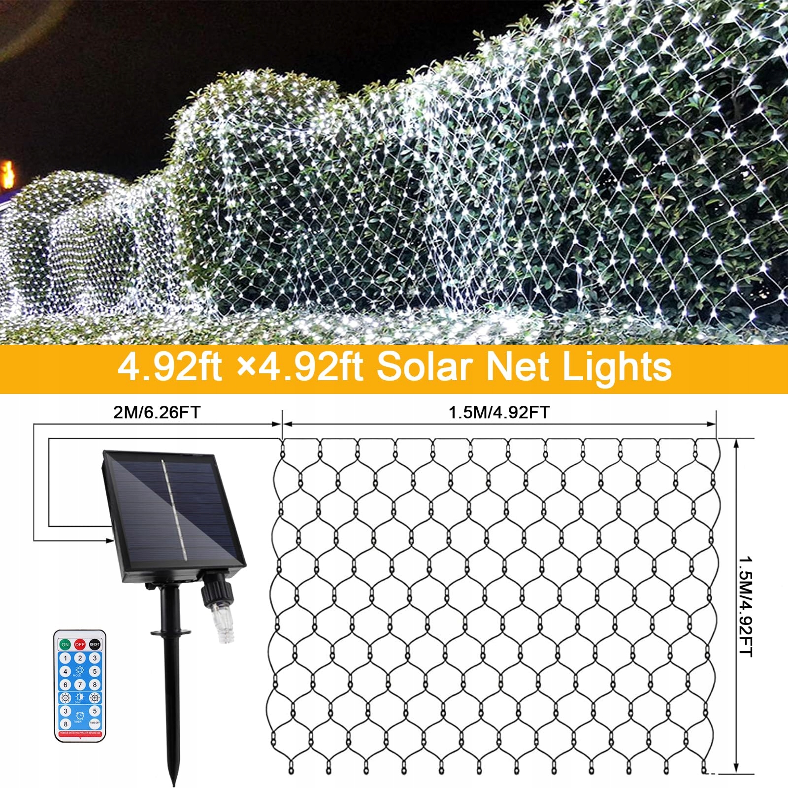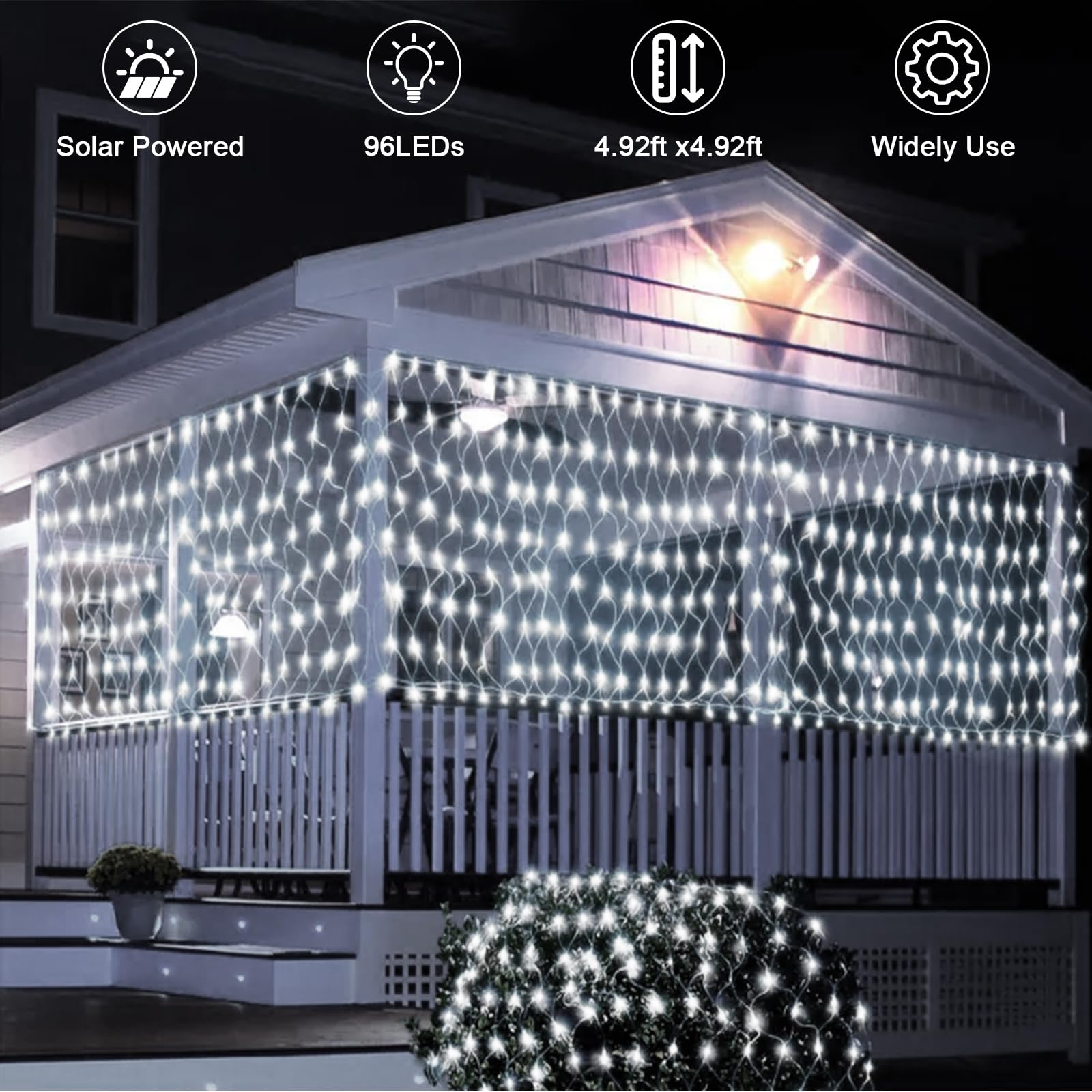 [Wodoodporność IP66 i timer] Zarówno świąteczne siatki świetlne, jak i panel solarny są wyposażone w wodoodporność IP66, co zapewnia niezawodne działanie w różnych warunkach pogodowych. Siatki świetlne LED mają 3 ustawienia czasowe (3, 5, 8 godzin) oraz przycisk TIME OFF, dzięki czemu nie musisz martwić się o rachunki za prąd! Siatki świetlne są idealne do oświetlania ścieżek lub werand dla bezpieczeństwa i widoczności.