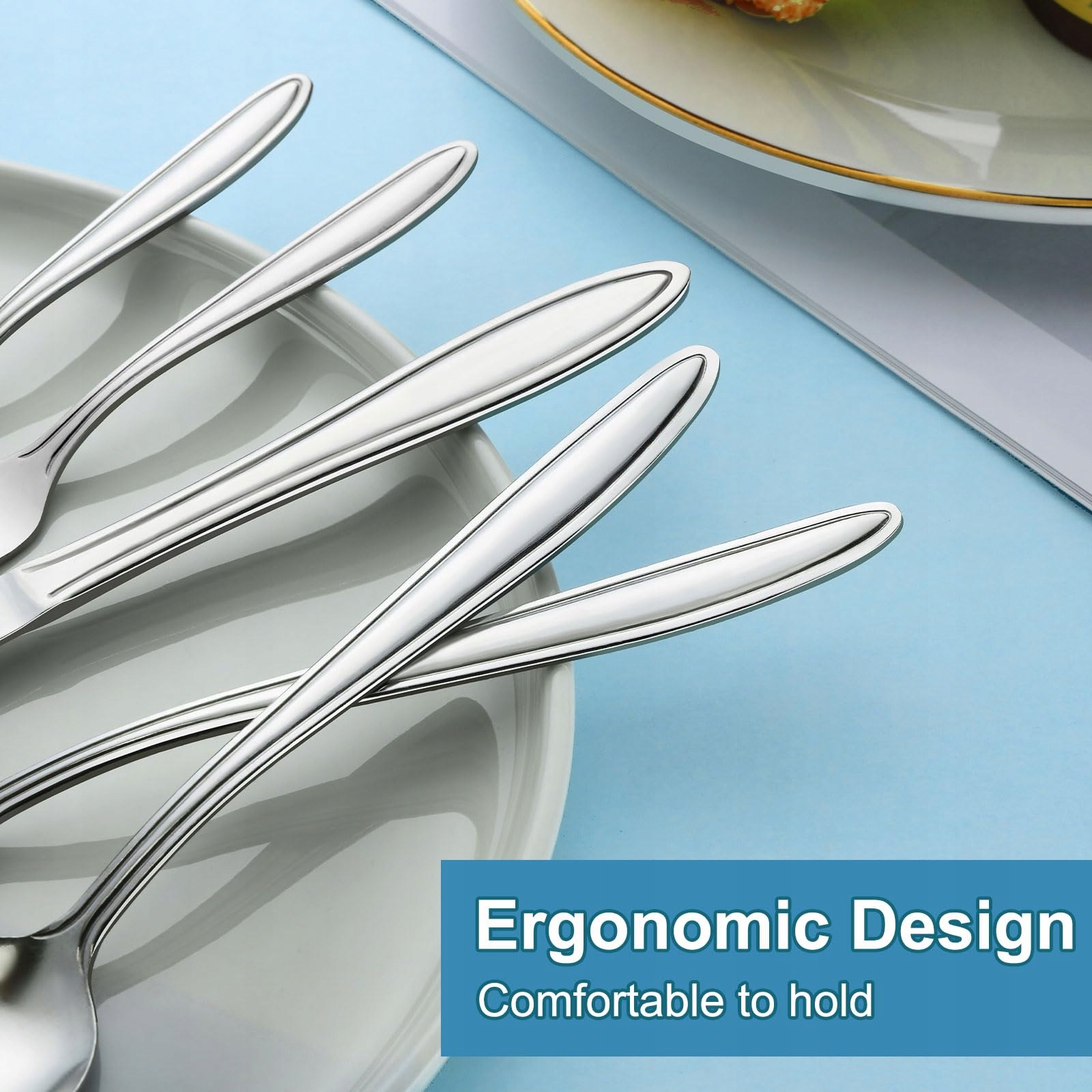 【Polerowany na wysoki połysk design】Nasz zestaw sztućców jest starannie polerowany, piękny i łatwy do czyszczenia. Krawędzie łyżek i widelców zostały wypolerowane w kilku etapach, dzięki czemu są gładkie i przyjemne w użyciu, nie ranią ust. Ostrza są ząbkowane i ostre, co oszczędza czas i wysiłek podczas krojenia potraw.