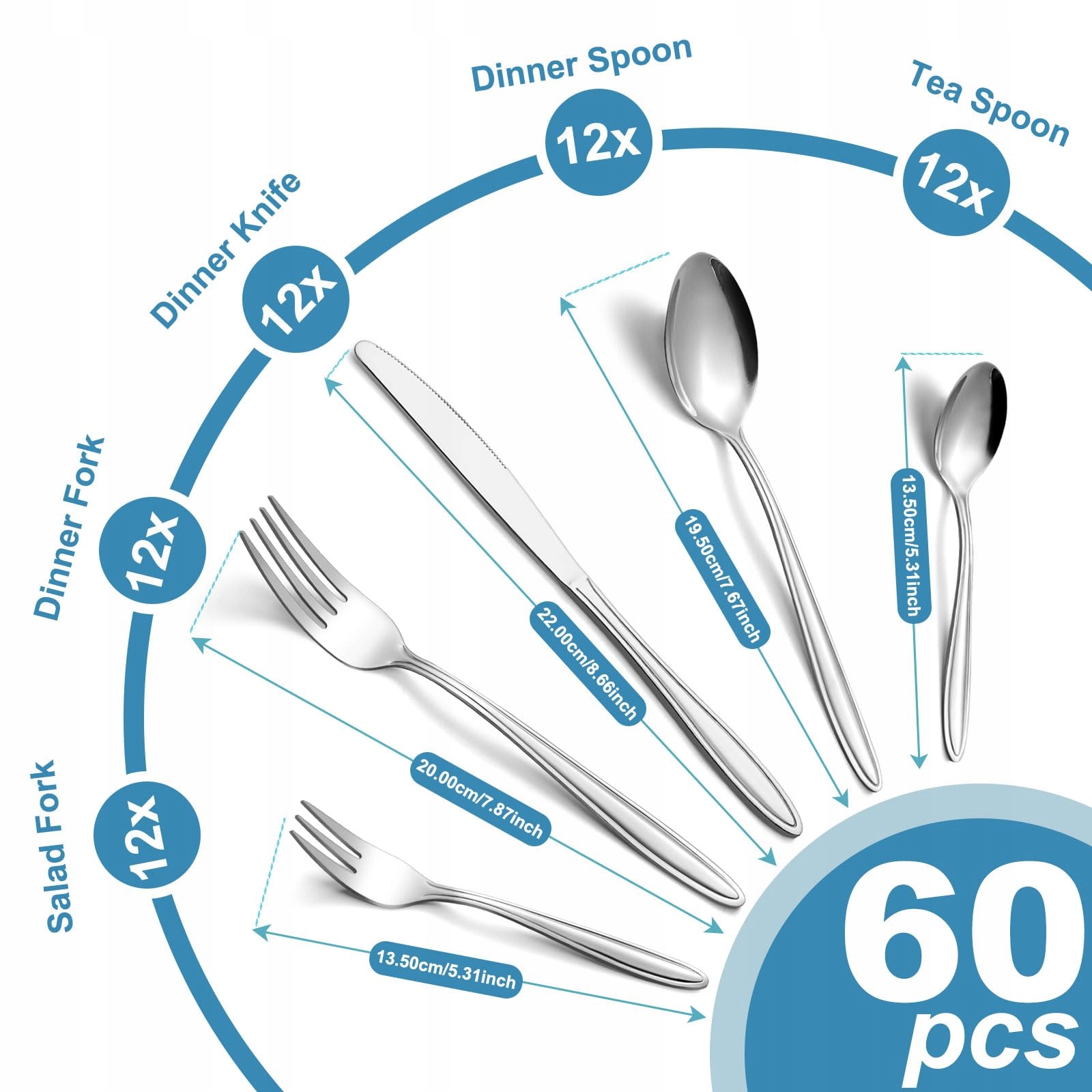 【Zestaw sztućców dla 12 osób】Zestaw sztućców Gifcomda 60-częściowy składa się z 12 noży stołowych, 12 widelców stołowych, 12 widelczyków do herbaty, 12 łyżek do zupy, 12 łyżeczek do herbaty. Idealne połączenie noży, widelców i łyżek na co dzień.