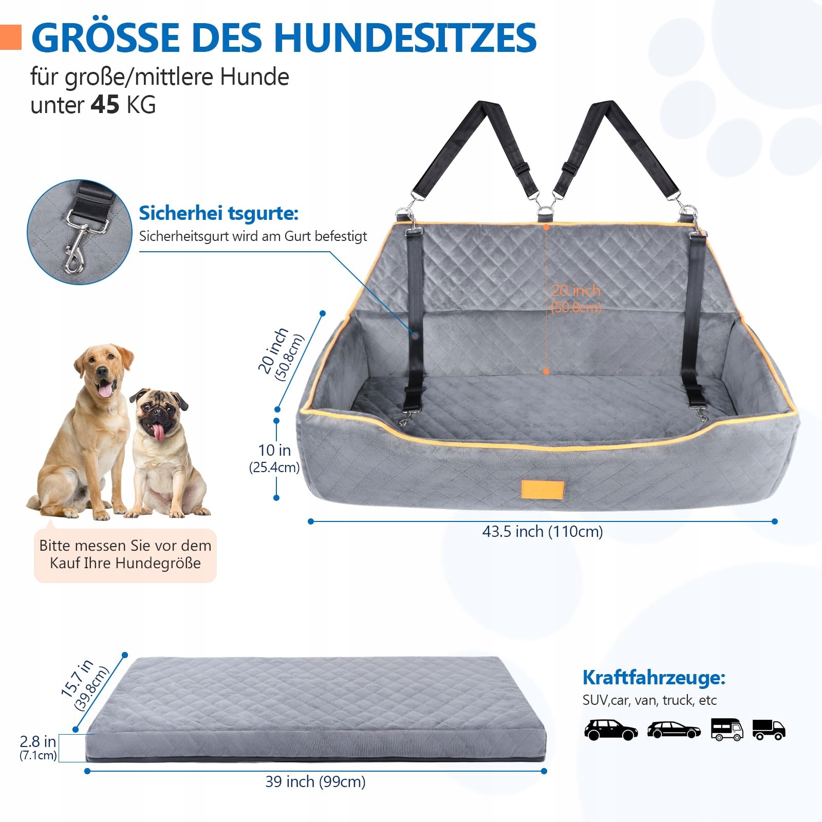 Super duży samochód dla psa: Duży fotelik samochodowy dla psa ma wymiary 110 cm (dł.) * 50,8 cm (szer.) * 20,4 cm (wys.), idealny dla dużych psów do 45 kg. Nie ma również problemu z przewożeniem dwóch małych i średnich psów do 16 kg. Przestronny fotelik samochodowy spełnia potrzeby różnych pozycji ciała Twojego psa, takich jak stanie, leżenie, kucanie itp. Pasuje do większości pojazdów dostępnych na rynku, takich jak samochody, ciężarówki, SUV-y itp.