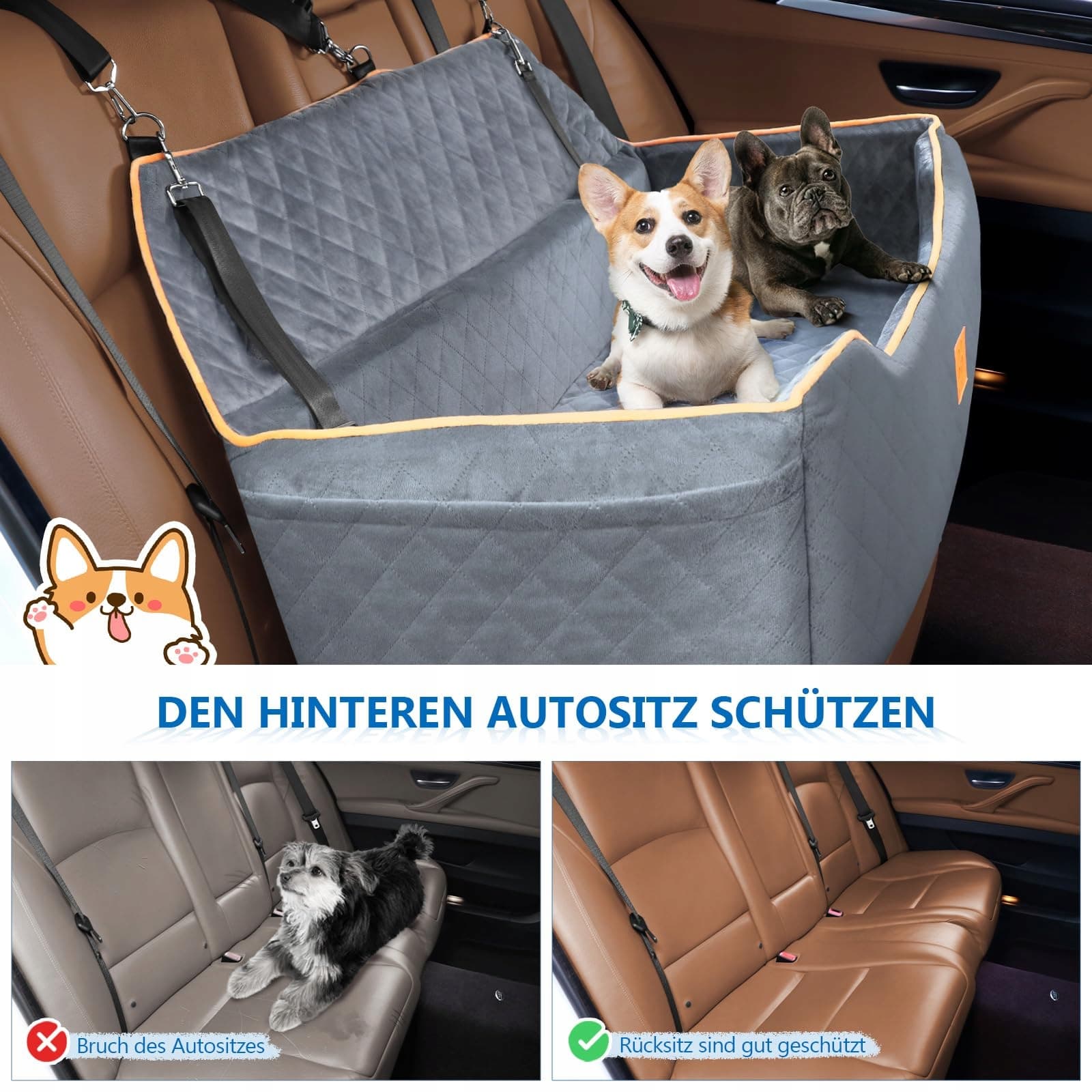 Łatwa instalacja: Przeprowadź pas bezpieczeństwa przez dwa otwory na spodzie fotelika samochodowego i wstaw zamek bezpieczeństwa. Zrób to samo po drugiej stronie. Następnie przymocuj pas bezpieczeństwa na górze fotelika samochodowego i dostosuj długość pasa bezpieczeństwa. Nadaje się zarówno do montażu na tylnym siedzeniu, jak i w bagażniku, gdzie jest dużo miejsca. Usuń pas, a fotelik samochodowy może być również używany w domu jako łóżko dla psa lub sofa.