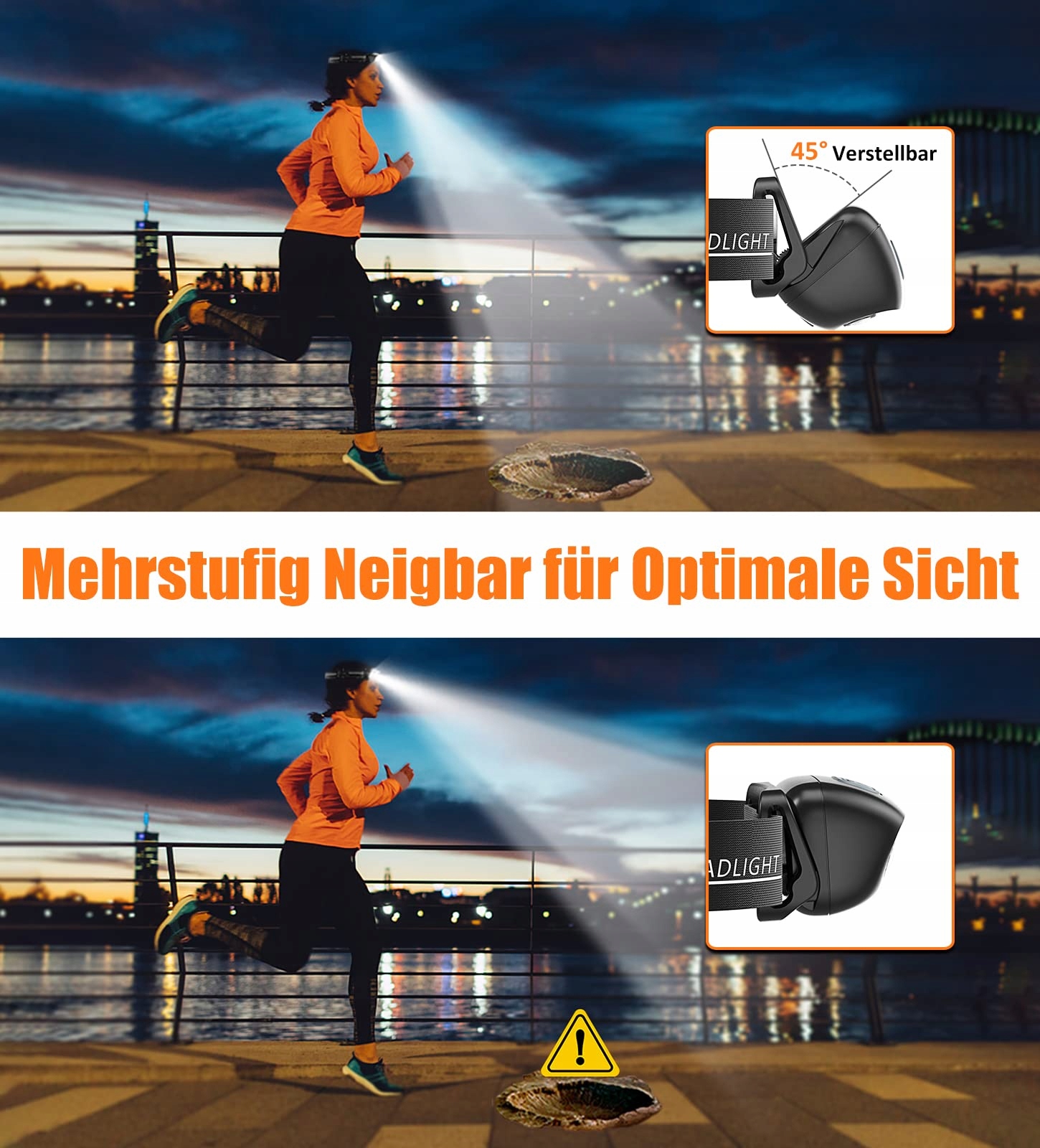 [Wodoodporna IPX6 i regulowana]Nasza latarka czołowa została zaprojektowana, aby wytrzymać wszelkie warunki pogodowe, od ekstremalnego upału po przenikliwy chłód, i została przetestowana pod kątem odporności na silny deszcz i śnieg. Regulacja nachylenia o 45° sprawia, że jest idealna do nocnych wędrówek, biegania po szlakach i campingowania.