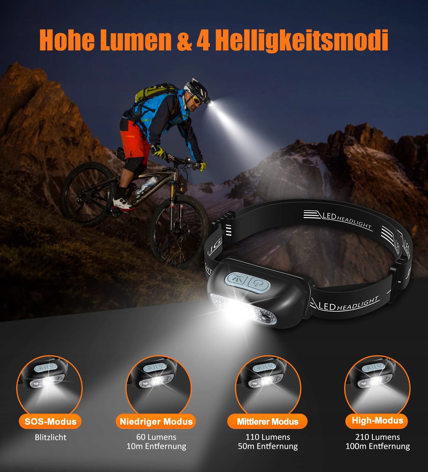 [Super jasna i 4 tryby oświetlenia]Cztery różne opcje oświetlenia: wysoki (210 lumenów), średni (110 lumenów), niski (60 lumenów) oraz tryb SOS błyskowy na wypadek sytuacji awaryjnych. Po prostu naciśnij przycisk trybu, aby przyciemnić lub rozjaśnić, a przytrzymaj przez 2 sekundy, aby przełączyć się na tryb SOS.