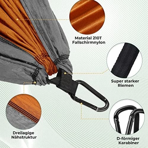 Idealny towarzysz na zewnątrz: W zestawie podwójny hamak kempingowy, 2 liny i 2 solidne karabinki. Nie musisz się już martwić o instalację. Powinno być więcej zabawy na świeżym powietrzu