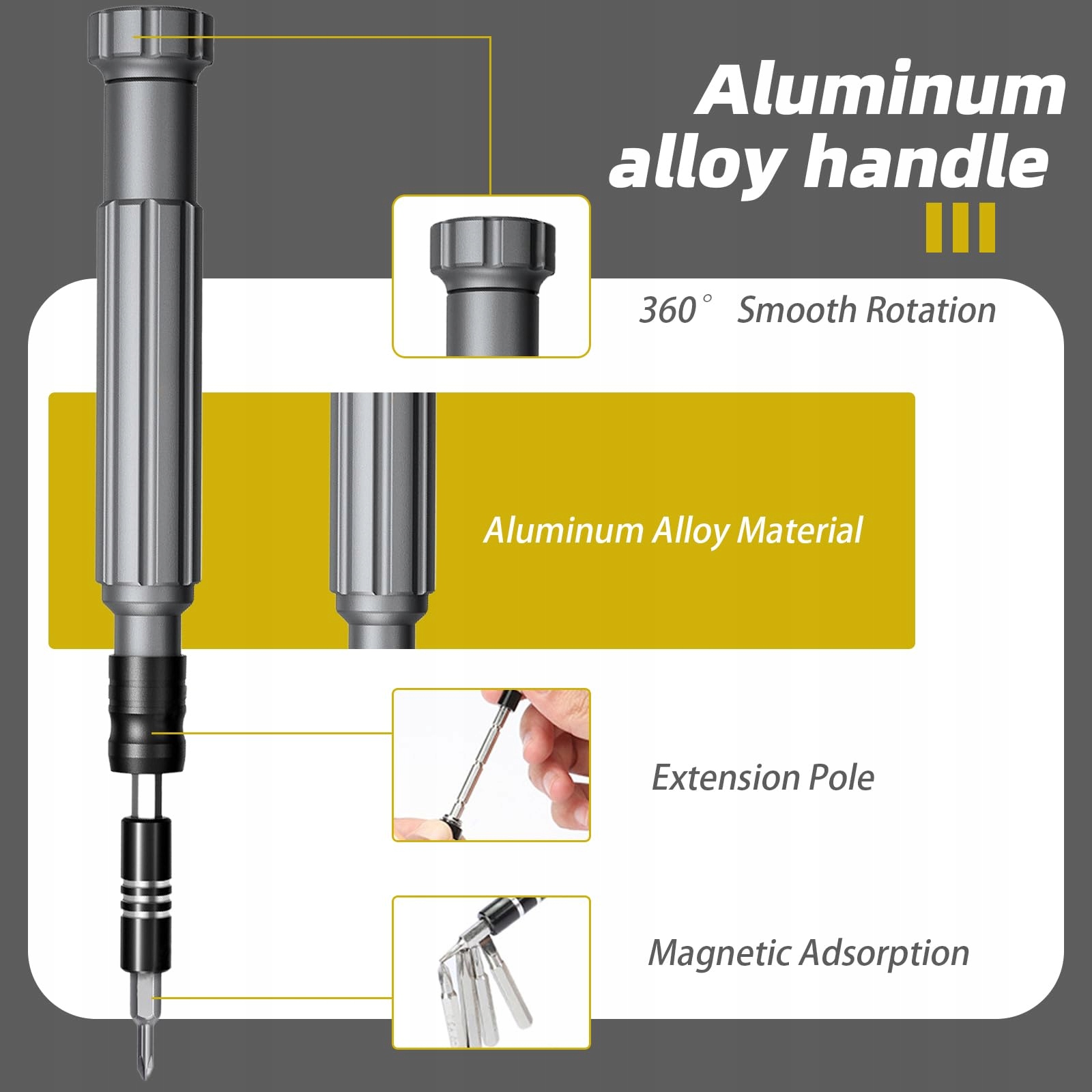 PRZEDŁUŻENIA ŚRUB: Wyposażony w elastyczną rurkę przedłużającą, może łatwo utrzymać każdą część. Zestaw przedłużek precyzyjnych (PH000, Y000, P2) został zaprojektowany z dłuższymi końcówkami, idealnymi do usuwania śrub w wąskich lub trudno dostępnych miejscach.