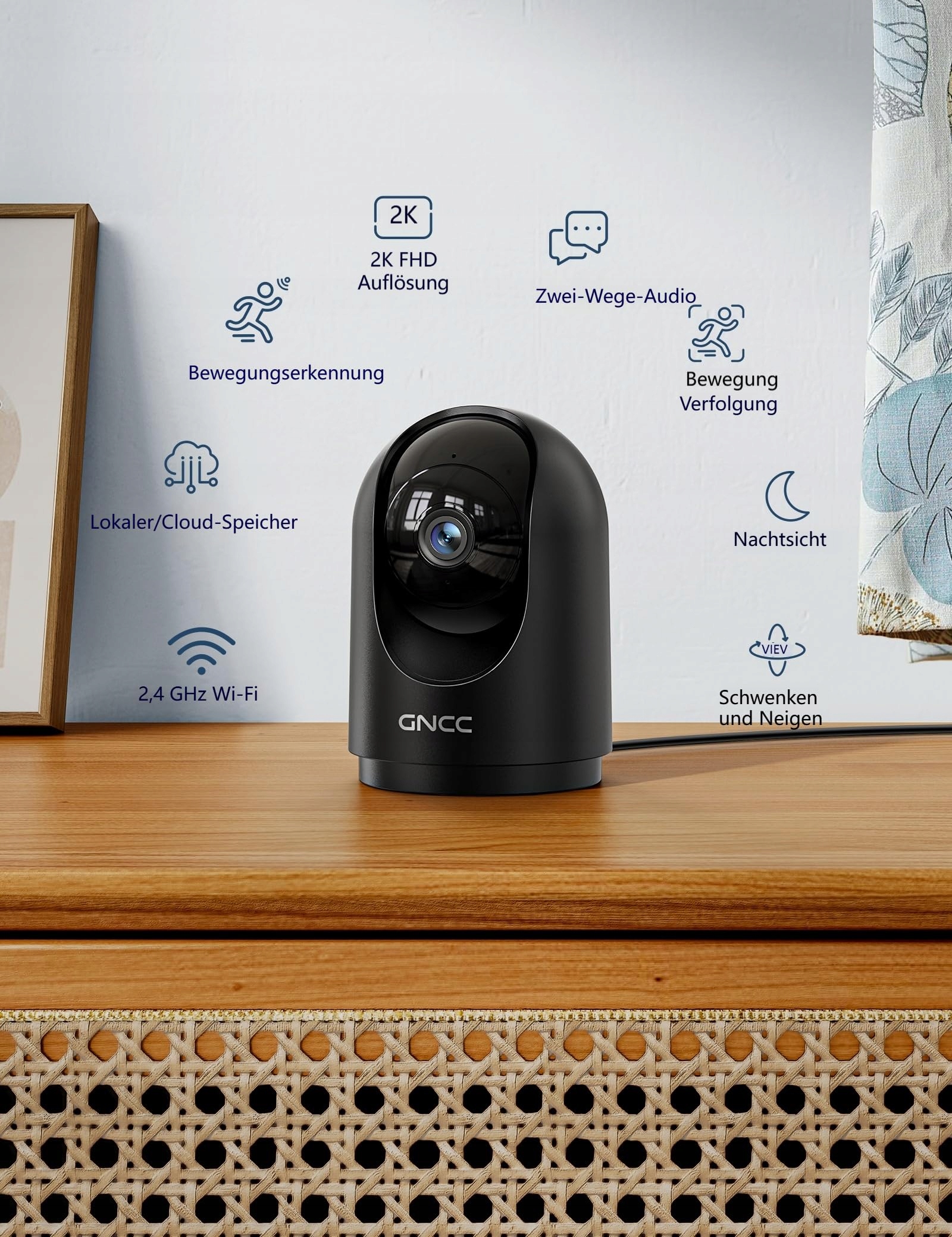 【Rozdzielczość 2K i pełne pokrycie】– Kamera monitorująca GNCC do wnętrz rejestruje każdy szczegół w wysokiej rozdzielczości 2K. Niania z kamerą z ruchem poziomym do 355° i pionowym do 60°, szerokie pokrycie, aby uchwycić każdą chwilę. (Uwaga: Kamera monitorująca do wnętrz obsługuje tylko Wi-Fi 2,4 GHz i nie jest kompatybilna z 5G.)