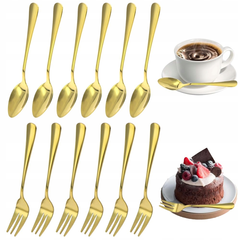 GOIYZTTR 24 sztuki zestaw widelców i łyżek Złote łyżeczki do herbaty i widelczyki do ciasta ze stali nierdzewnej Nowoczesny i elegancki zestaw łyżek stołowych i widelców na przyjęcia, wesela, restauracje (12 łyżek + 12 widelców)