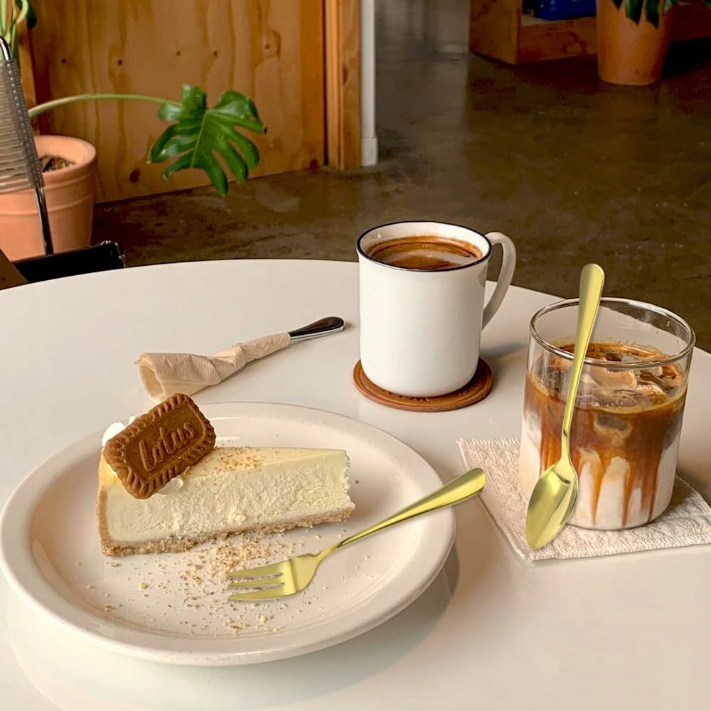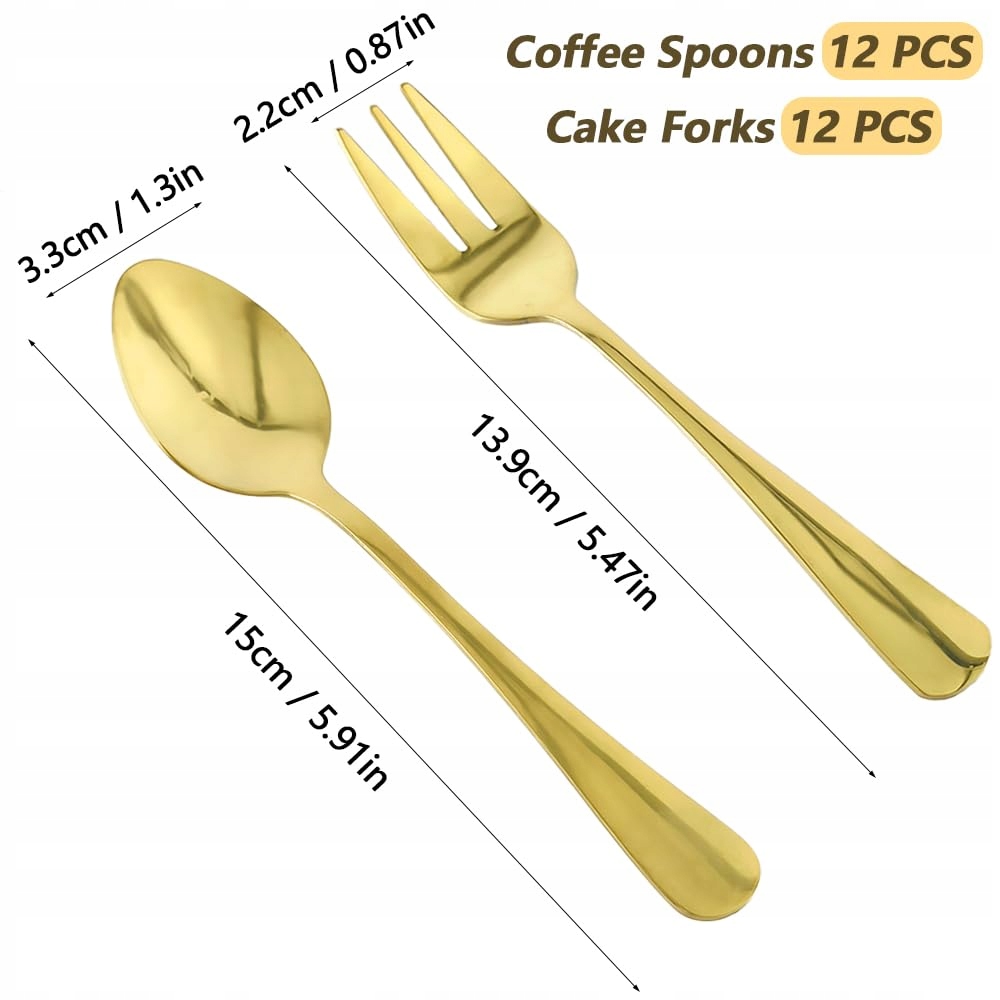🍴[Lista opakowania] W opakowaniu znajduje się 24 sztuki złotych łyżeczek do herbaty i widelczyków do ciasta (12 łyżek + 12 widelców); rozmiar wynosi 15 cm / 5,9 cala; ilość wystarcza, aby zaspokoić Twoje codzienne potrzeby