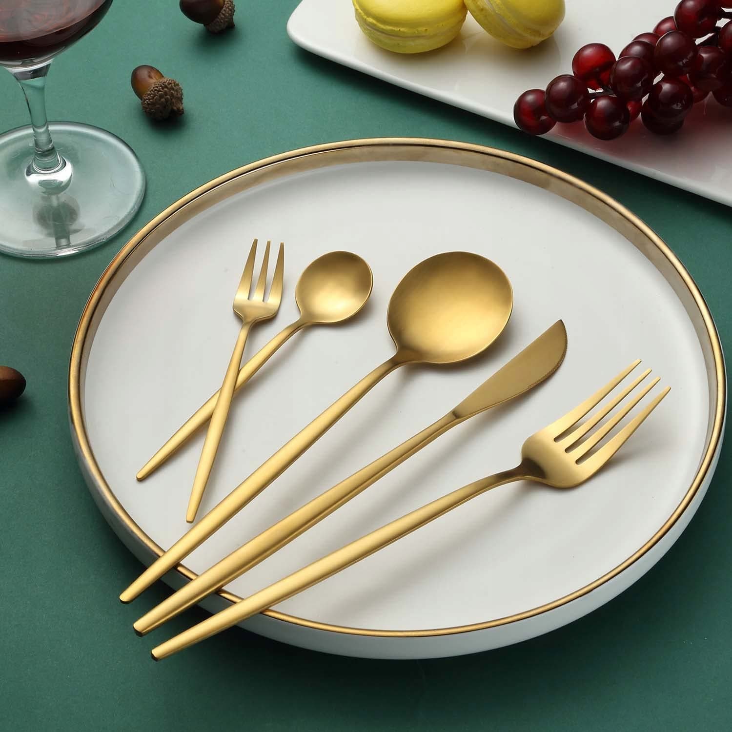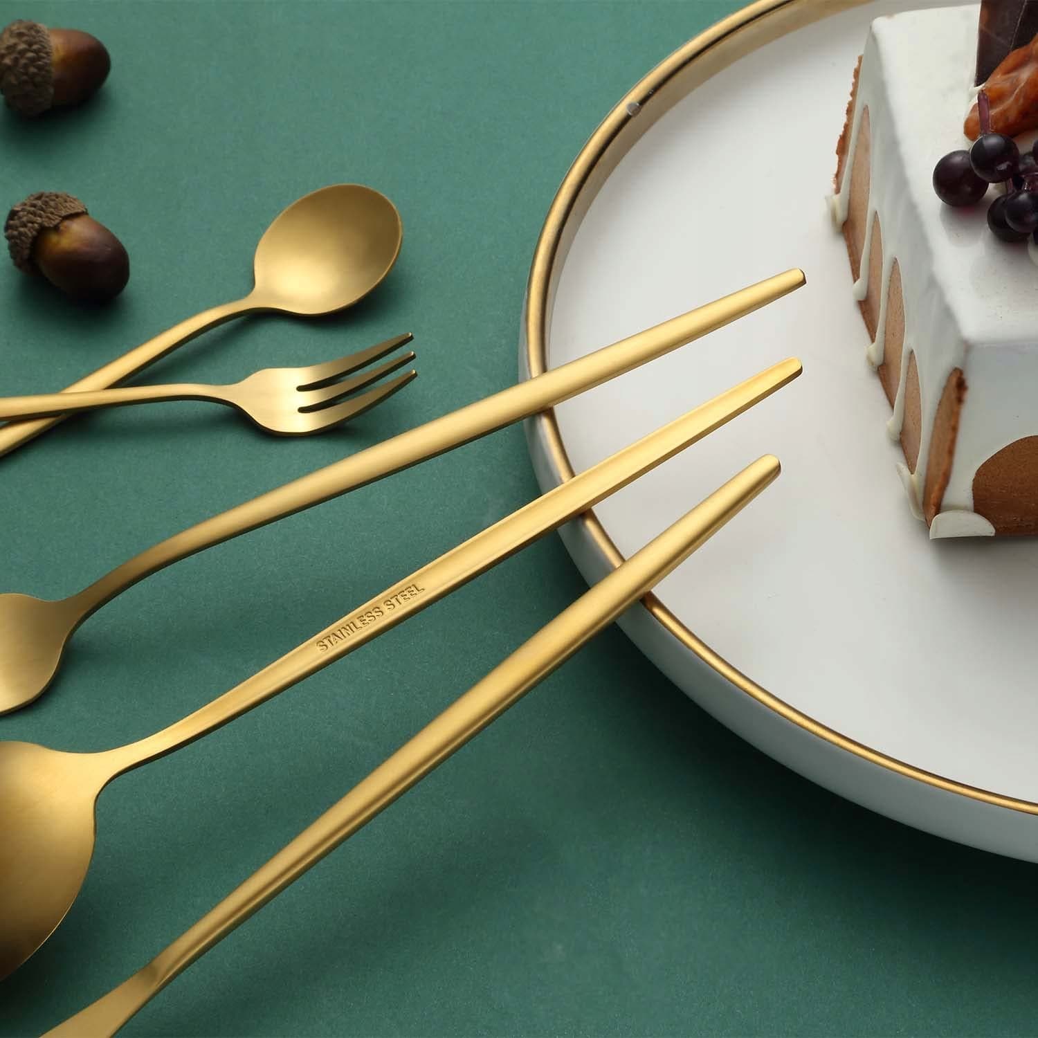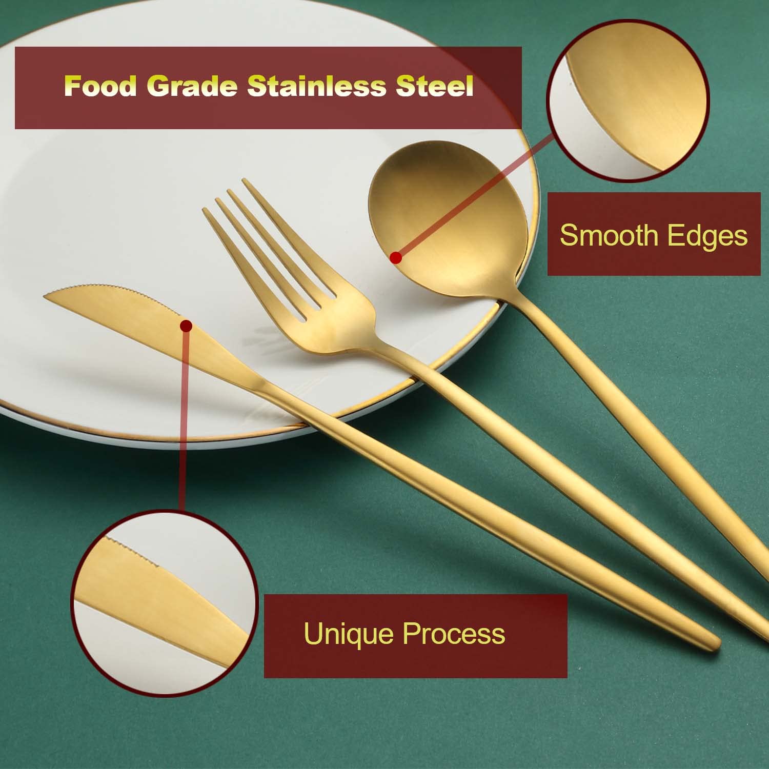 【Elegancki design】 Prosty wygląd, klasyczny design sprawiają, że są na tyle eleganckie, aby pasowały do wszystkich Twoich istniejących złotych sztućców lub zastawy stołowej i uczyniły codzienność wykwintnym doświadczeniem kulinarnym. Matowe wykończenie i elegancki, zakrzywiony design zestawu sztućców nadają mu elegancji i delikatności, dzięki czemu pasuje do każdego stylu wnętrza.