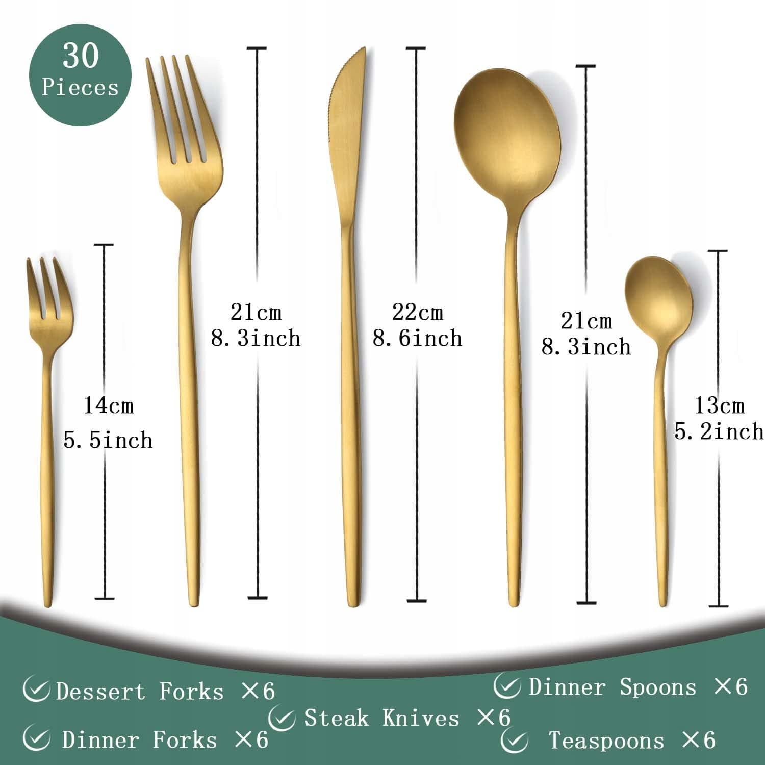 GOLD MATT Zestaw Sztućców 30 Elementów Dla 6 Osób Stal Nierdzewna Złote