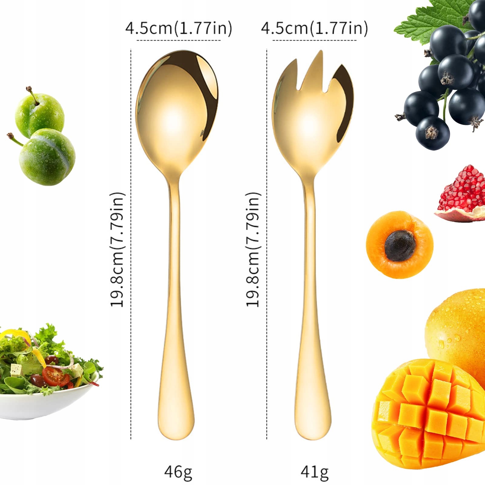 Rozmiar: Zarówno łyżka do sałaty, jak i widelec do sałaty mają rozmiar 4,5 * 20 cm, a waga wynosi około 49 g. Leży wygodnie i komfortowo w dłoni.