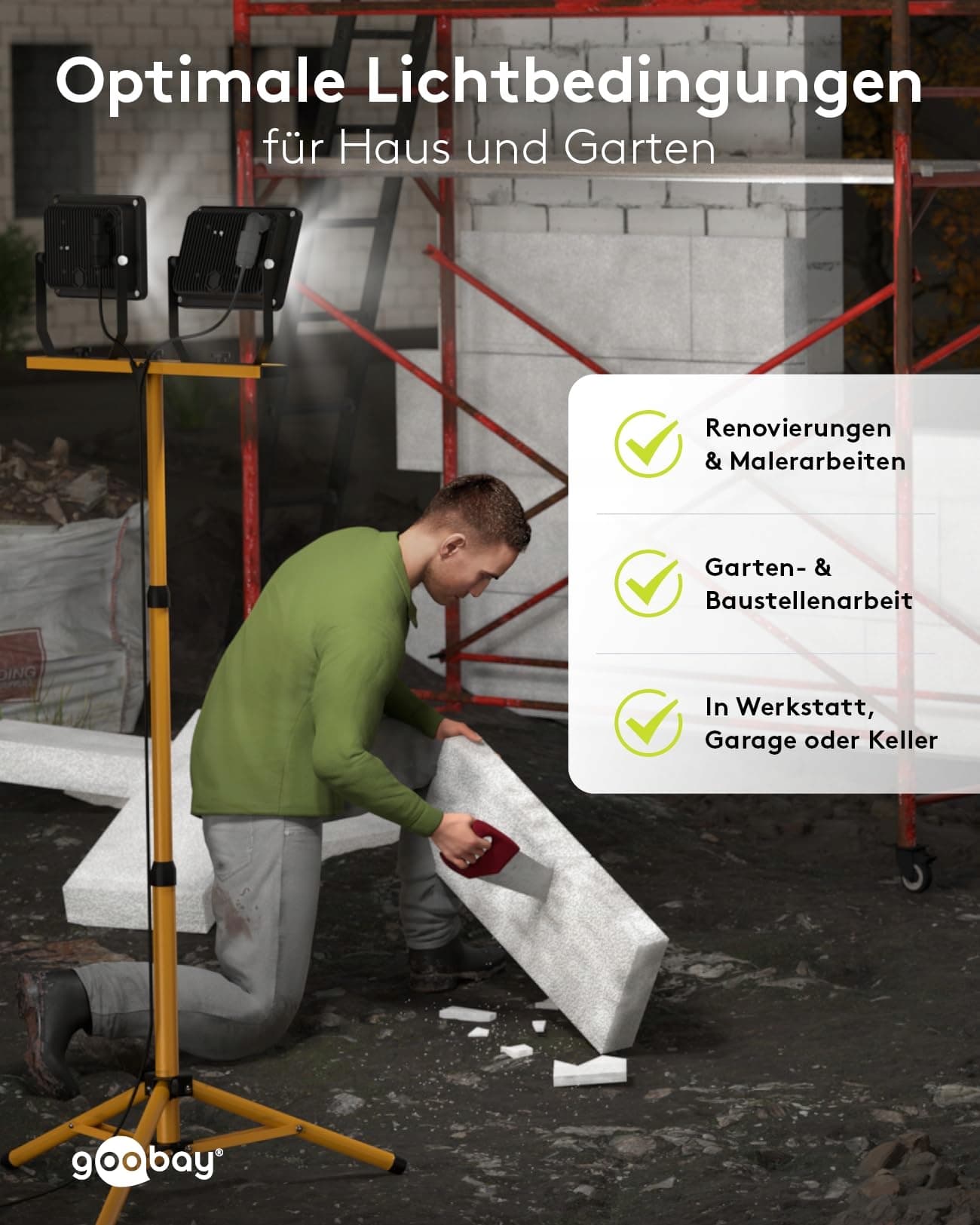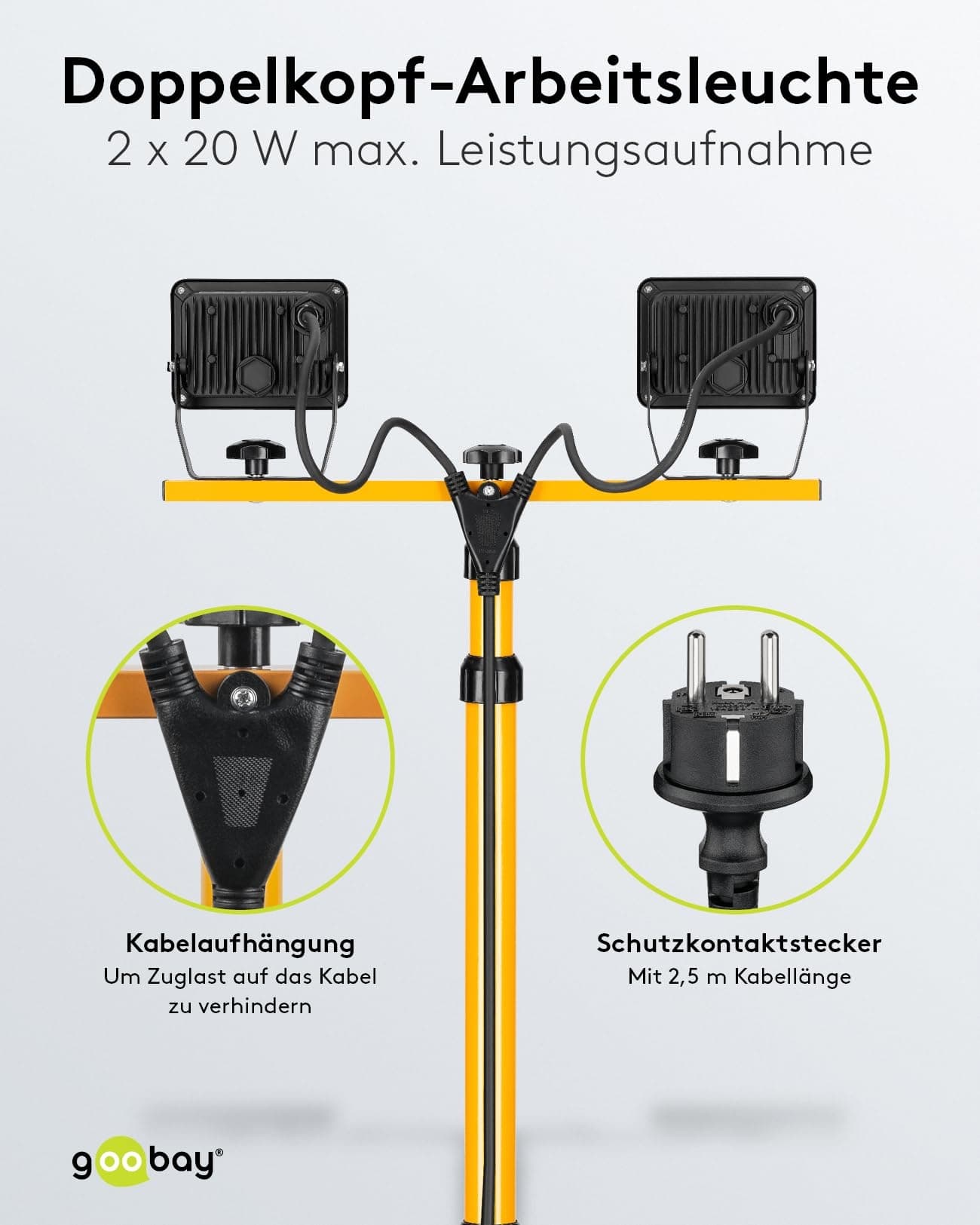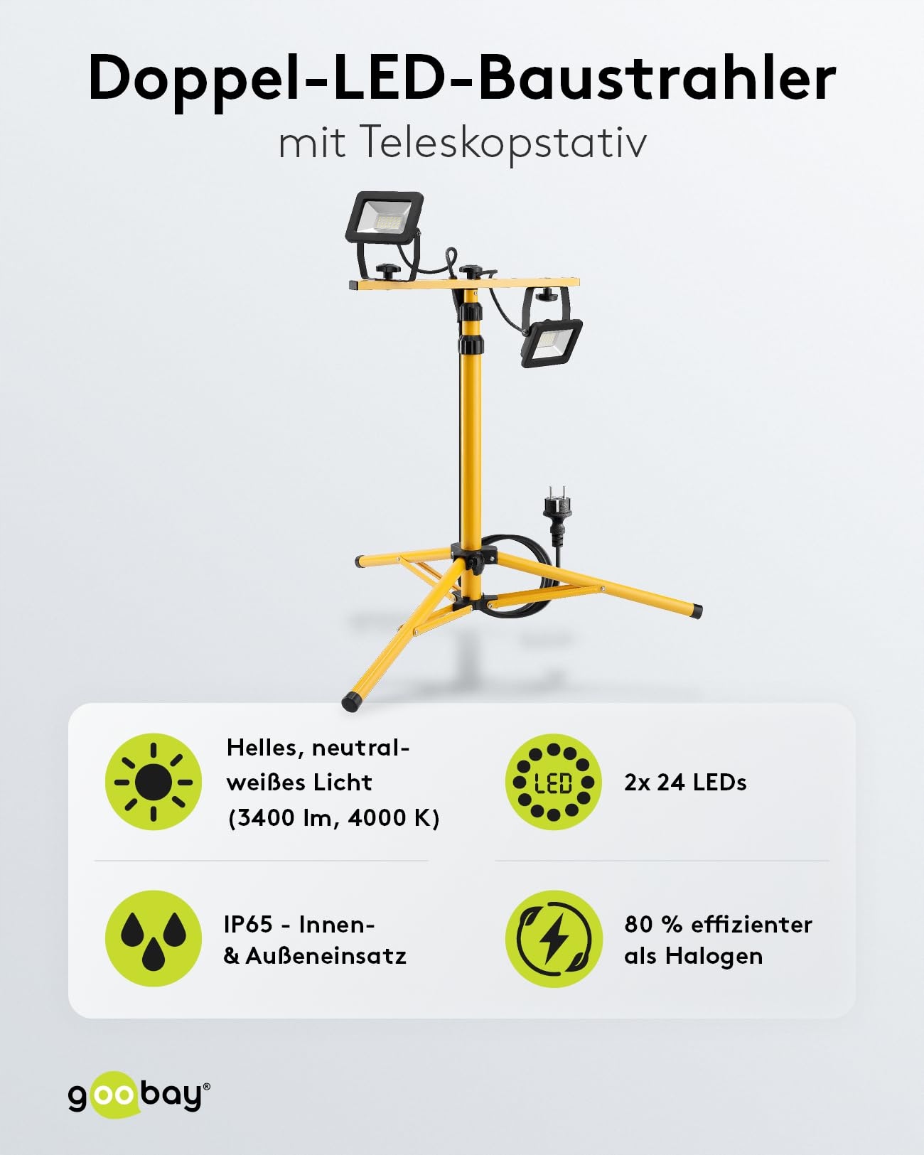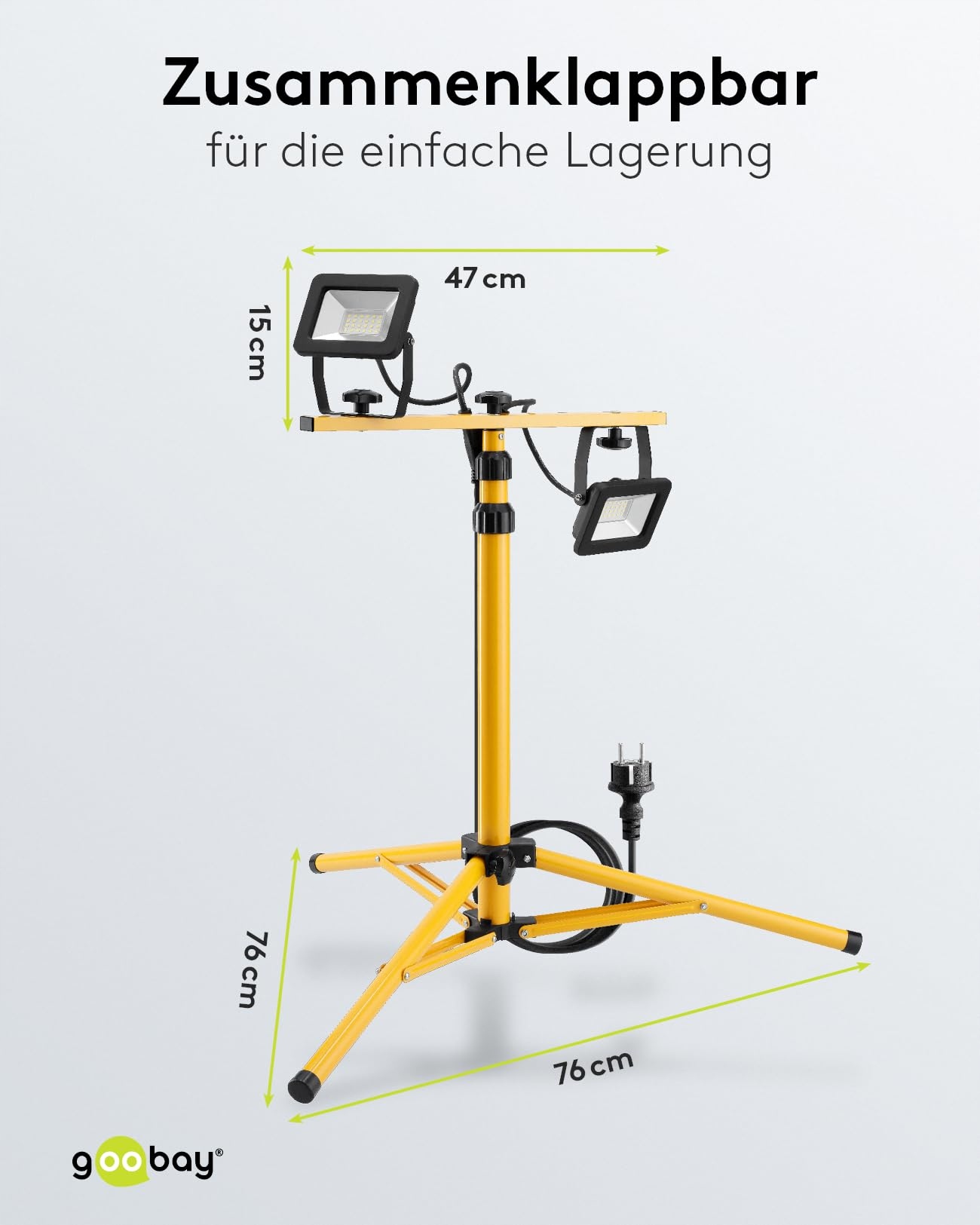Goobay 57845 LED reflektor na statywie teleskopowym 2 x 20W / 3400lm / Neutralna-biała światło – 4000K / Do wnętrz i na zewnątrz – IP65 / Czarny/Żółty
