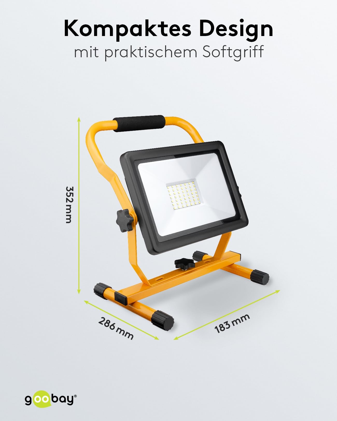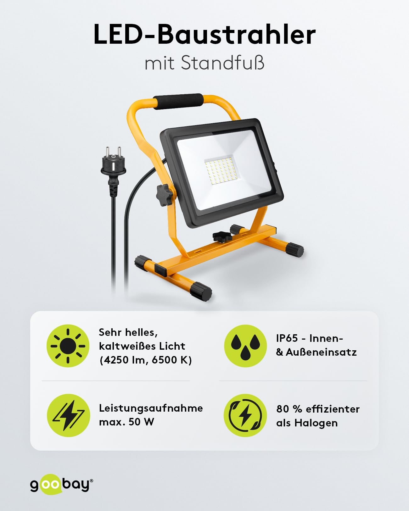 goobay 49983 Reflektor budowlany LED ze stojakiem, do użytku wewnętrznego i zewnętrznego, metalowy stojak, światło zimno-białe, 50 Watt, żółty