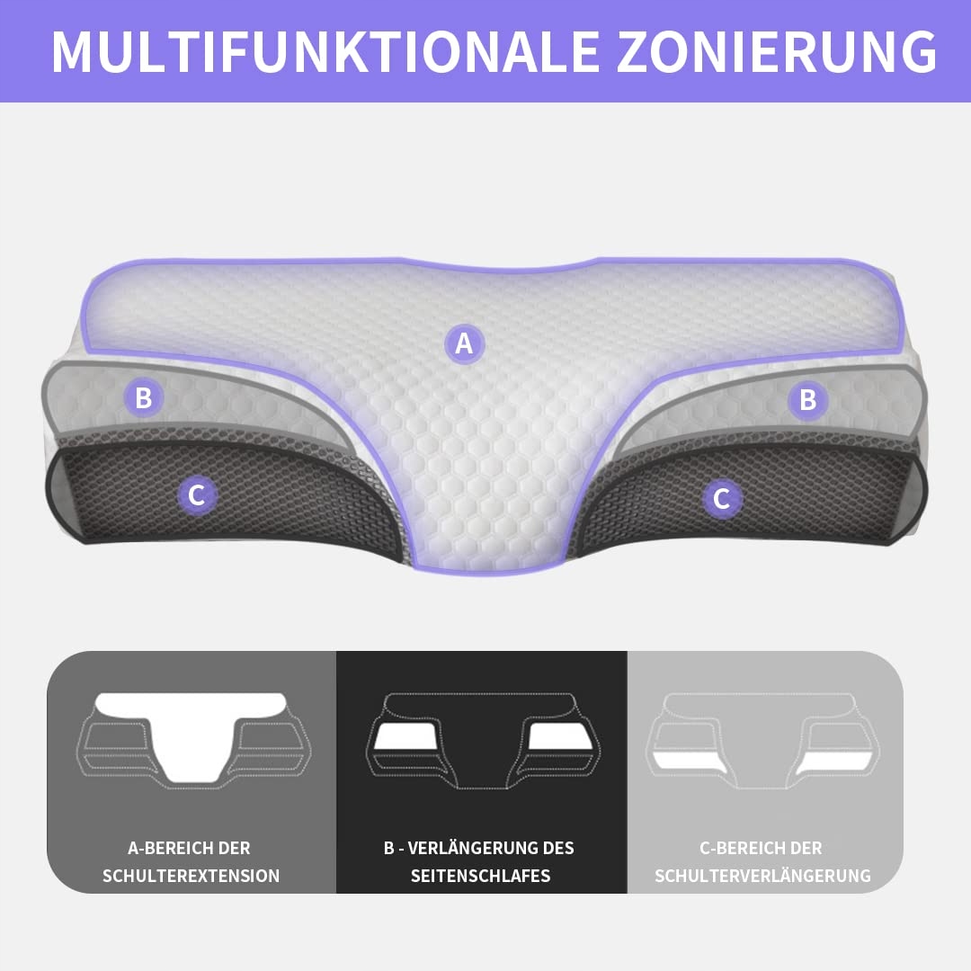 【Ergonomiczny design】Poduszka Good Nite z rowkiem została zaprojektowana z pięcioma strefami, aby spełnić różne potrzeby podczas spania na boku, głębokiego snu, podparcia głowy, podparcia karku i podparcia kręgosłupa szyjnego. Zakrzywiony kształt dopasowuje się do ludzkiego kręgosłupa szyjnego jako całości i delikatnie go wspiera