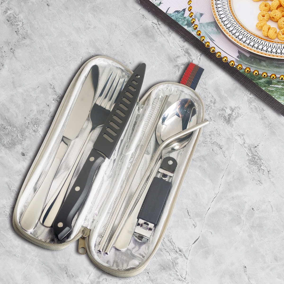 Wyjątkowe detale: Zestaw sztućców turystycznych ma gładką powierzchnię i ergonomiczne uchwyty, dzięki czemu możesz wygodnie cieszyć się posiłkiem. Zestaw jest przystosowany do mycia w zmywarce dla łatwego czyszczenia.
