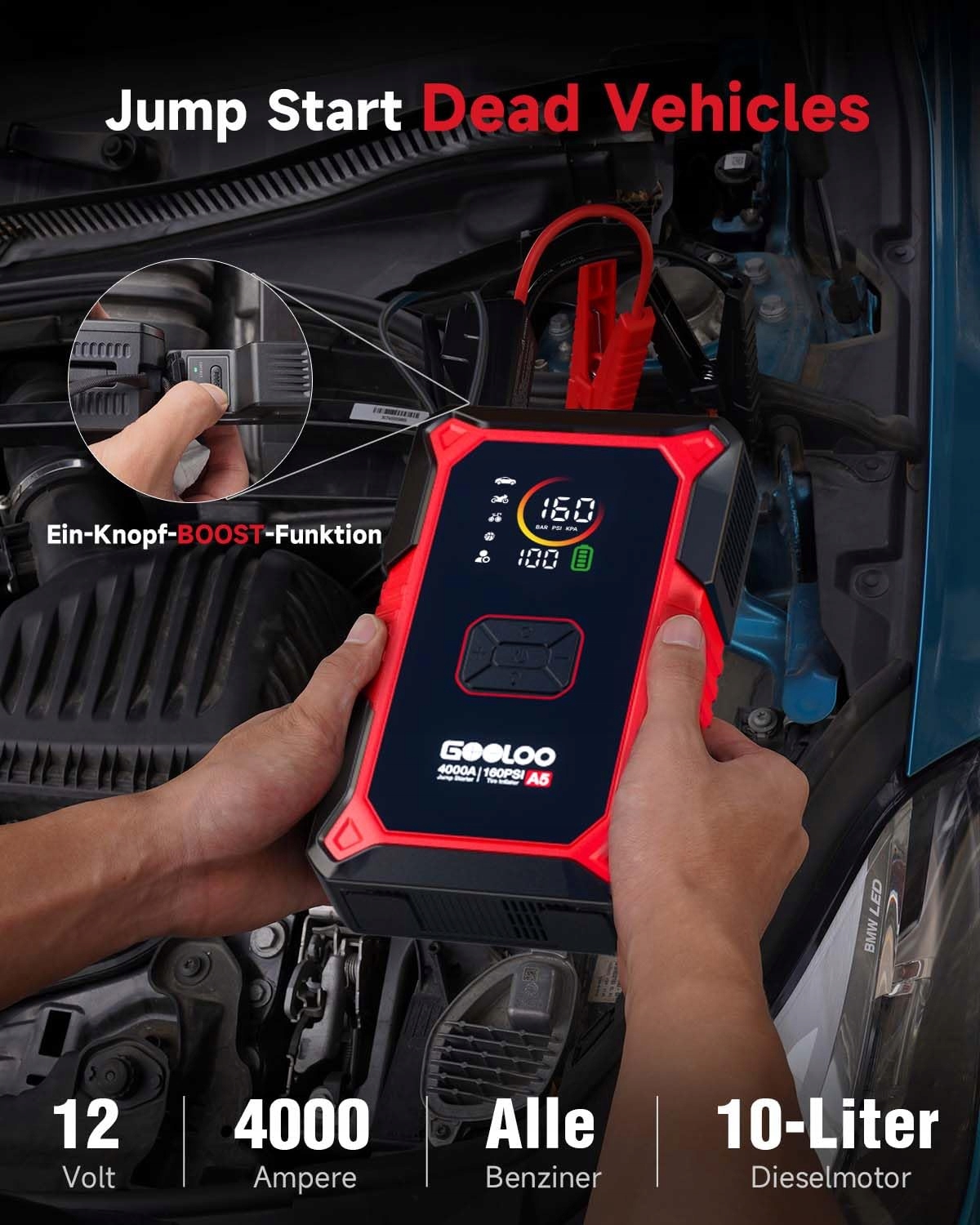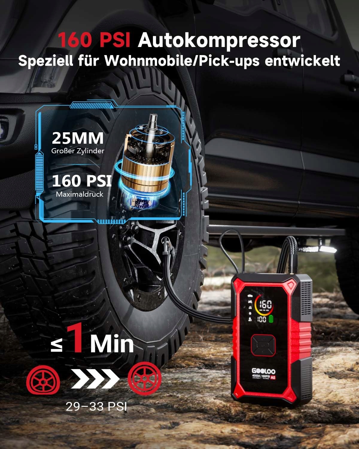 GOOLOO A5 Powerbank rozruchowa z kompresorem, rozruchowa powerbank 4000A (wszystkie benzynowe i do 10L diesla) z pompką powietrza 160PSI i szybkim ładowaniem USB-C 45W, przenośna powerbank 12V