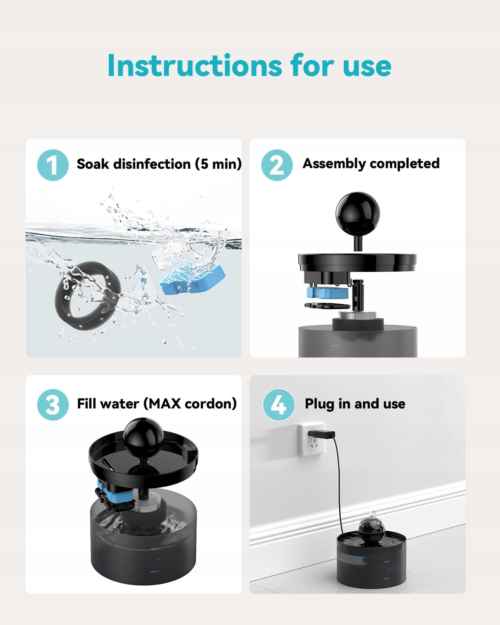 [Ciepłe wskazówki] Regularna wymiana filtra fontanny dla kotów może zapewnić lepsze doświadczenie picia dla Twojego zwierzaka, zalecamy wymianę filtra co 2-4 tygodnie, aby chronić zdrowie Twojego zwierzaka. Proszę namoczyć filtr przez 5 minut przed użyciem, aby usunąć pył węglowy powstały podczas transportu.