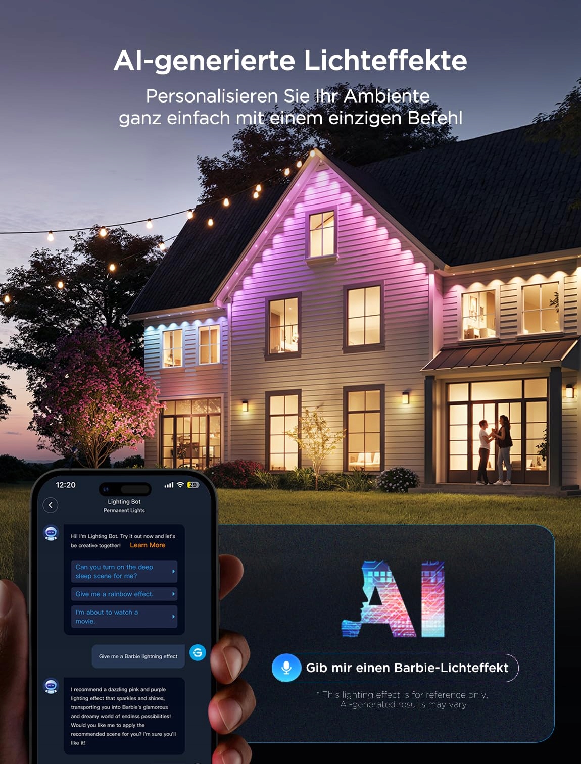 AI-Show Świetlne: Oprócz 75 wstępnie ustawionych trybów scen i oświetlenia DIY, które oferują dekoracje na Halloween na zewnątrz, AI generuje efekty świetlne. Twórz swoją atmosferę w dowolnym momencie za pomocą jednego polecenia, nawet podczas świąt i wydarzeń sportowych.