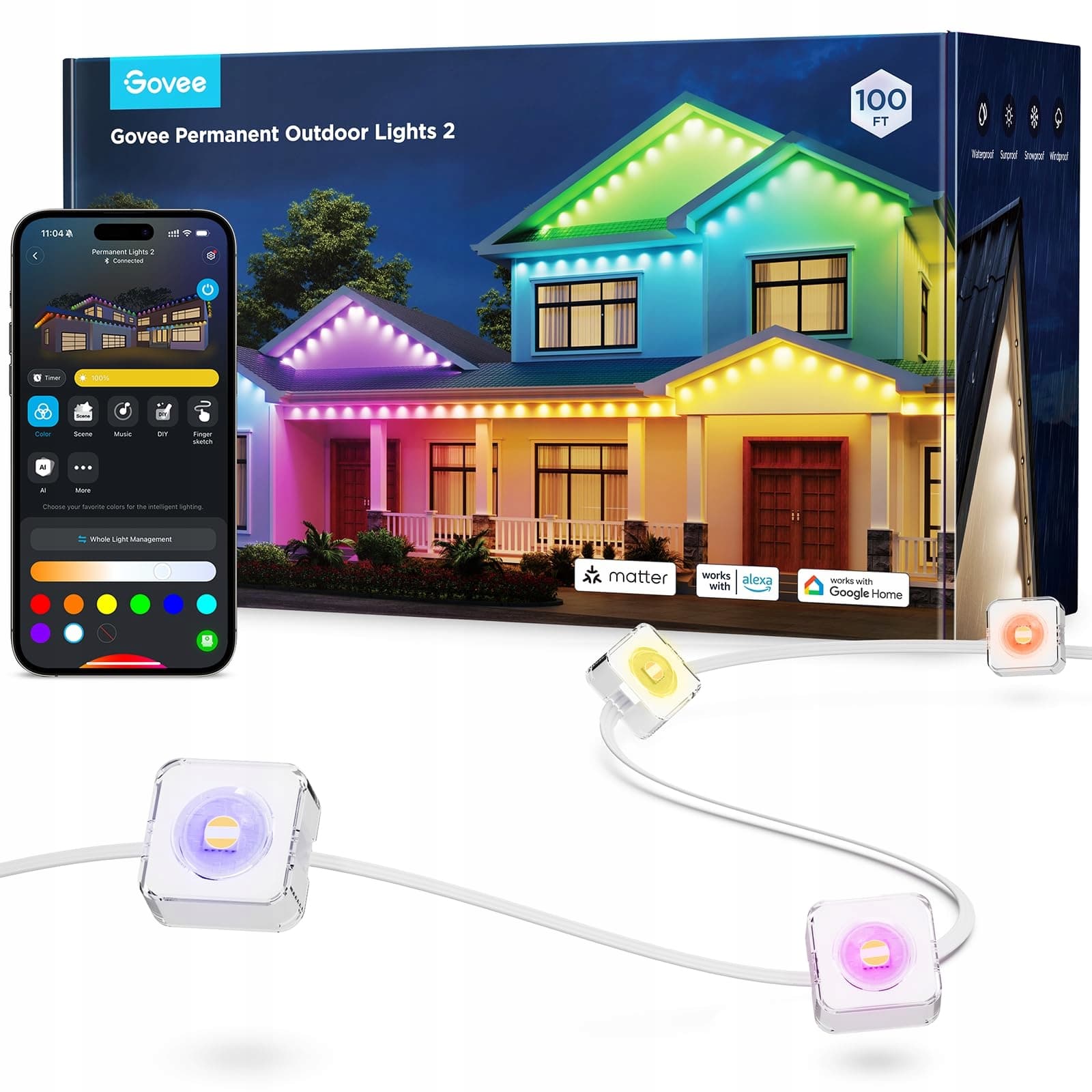 Govee Permanentne Światła Zewnętrzne 2, 30m RGBIC Światła Zewnętrzne z 72 LED Światłami, 40lm, IP67 Wodoodporne łańcuchy świetlne na zewnątrz, 100 Trybów Scen do Dekoracji, Praca z Alexa, Google Assistant, Biała Wersja