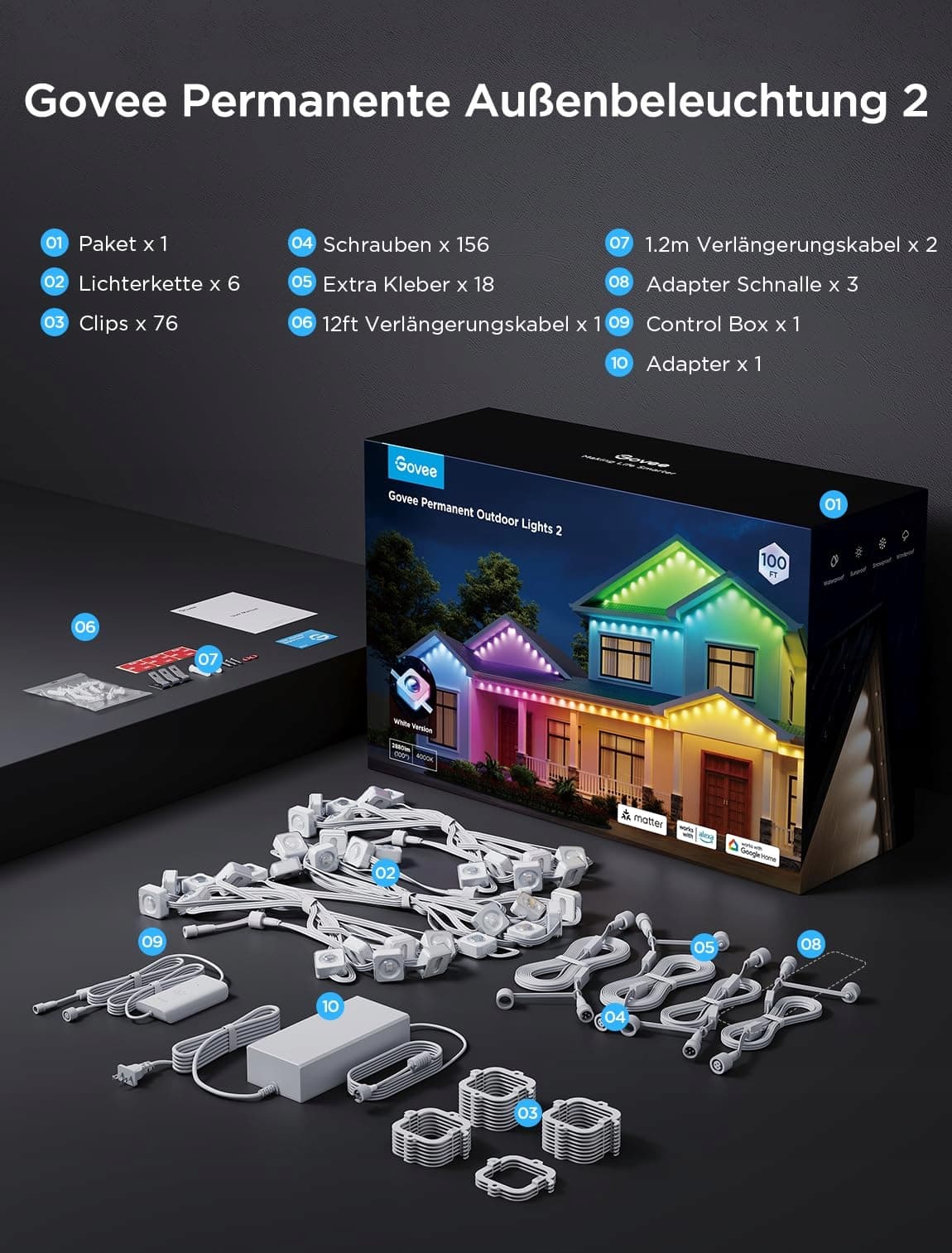 Łatwa Instalacja: Użyj dołączonego kleju VHB i klipsów, połącz przez wodoodporne złącza co 16.4ft na okapie. Govee permanentne światła zewnętrzne 2 nie mogą być cięte i można je podłączyć tylko do 9 segmentów świetlnych i 4 kabli przedłużających (2*366cm & 2*122cm).