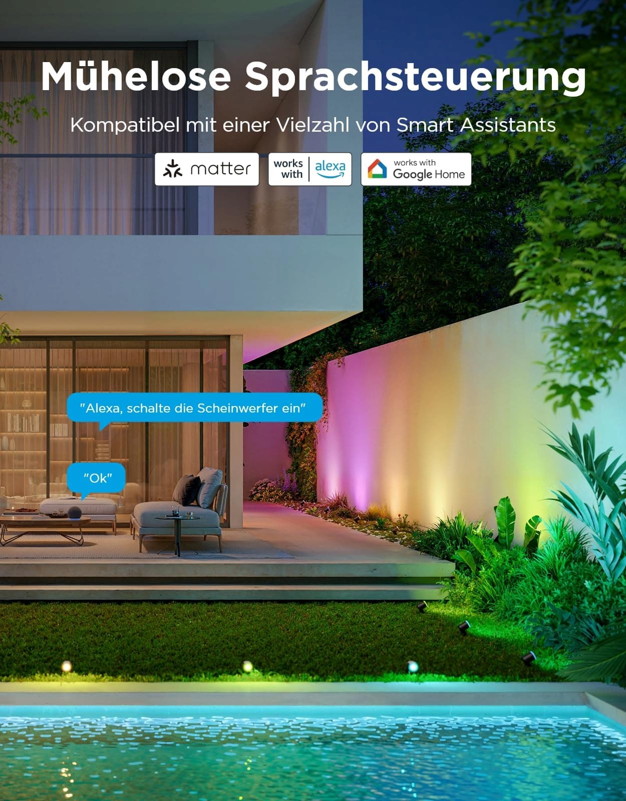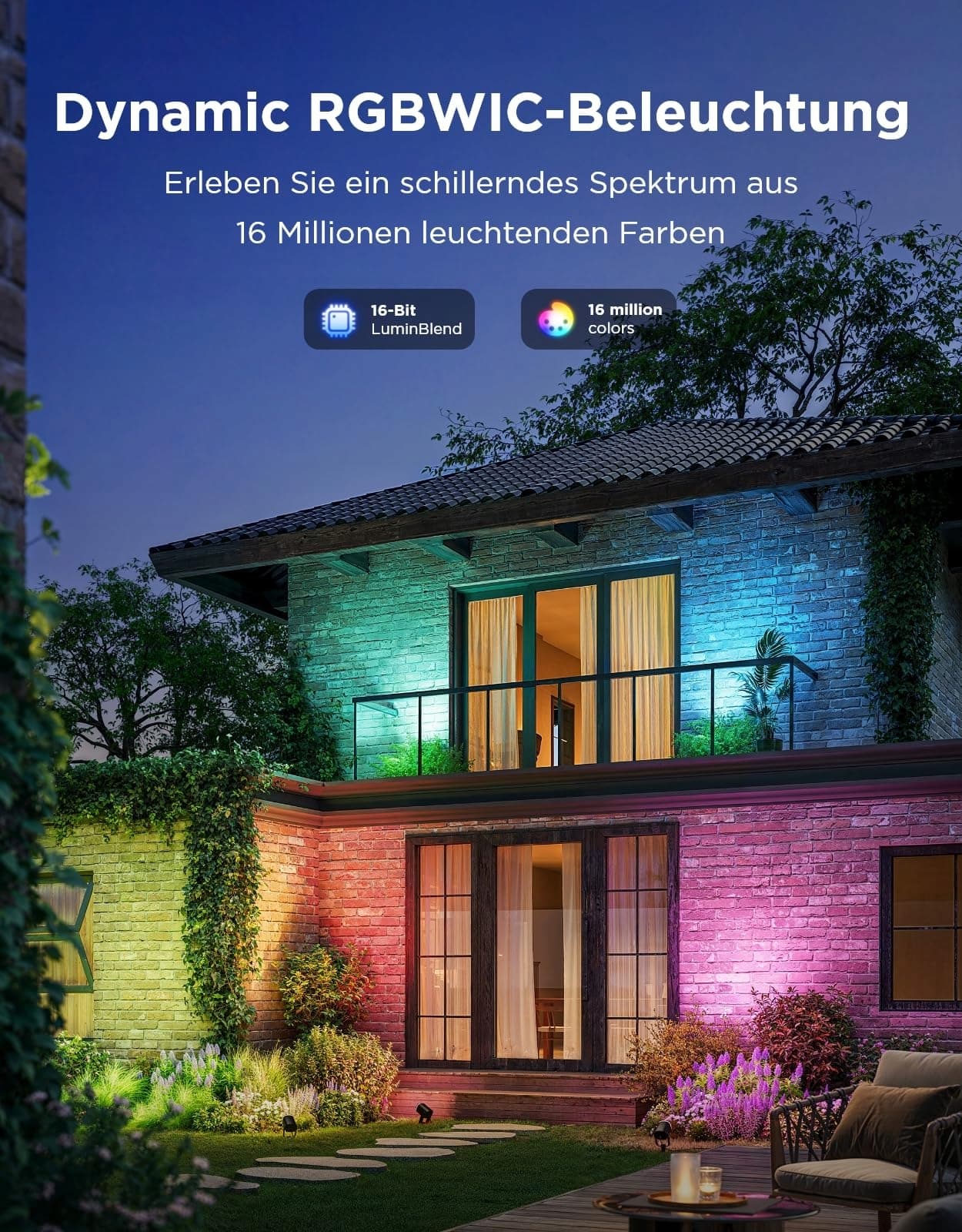 16 milionów żywych kolorów: Wyposażony w ulepszone diody RGBWIC oraz 16-bitowy system sterowania LuminBlend, który zapewnia 16 milionów żywych kolorów z płynnymi przejściami, idealny do oświetlenia ogrodowego i codziennego.