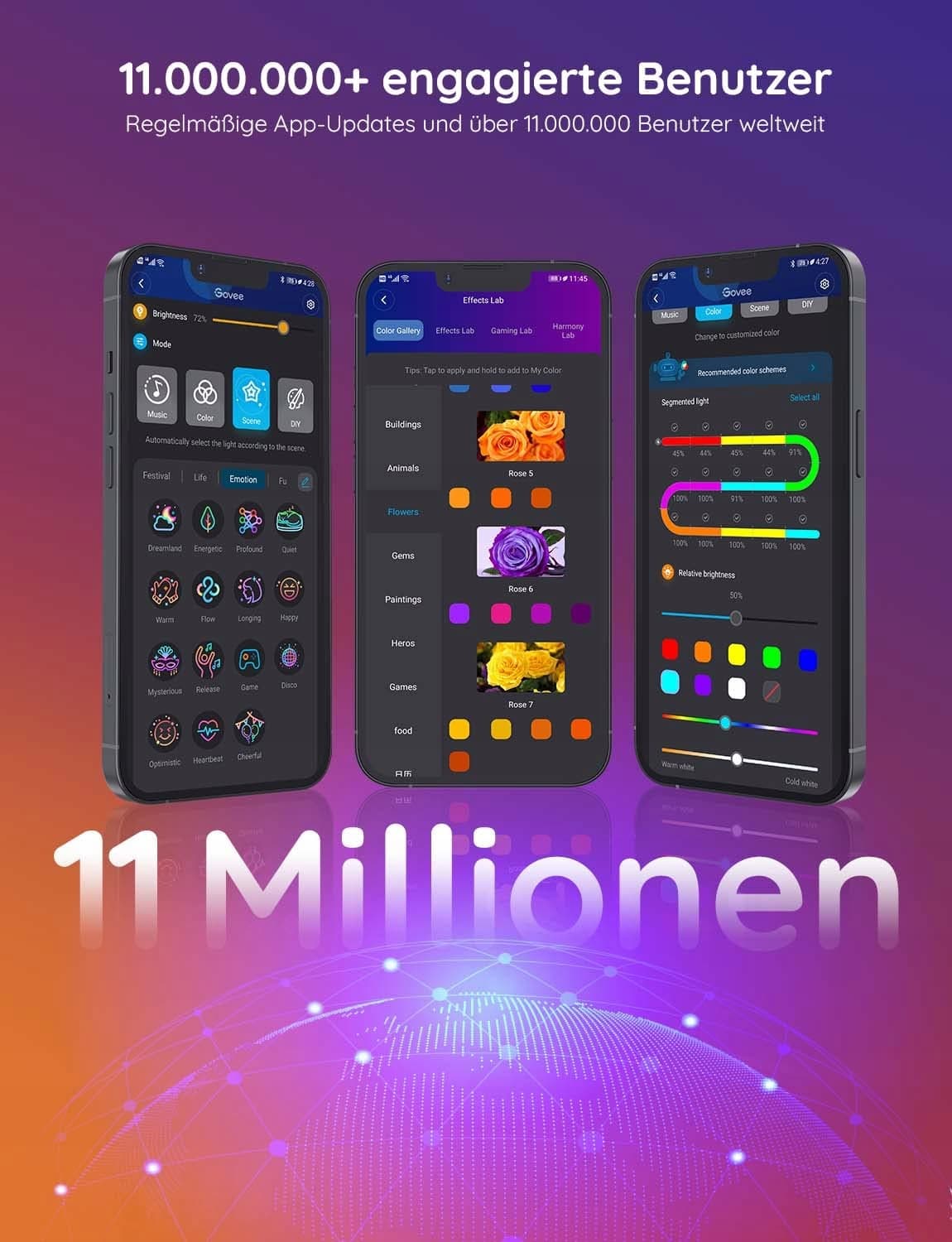 Ponad 64 Wstępnie Ustawione Efekty Scen: Wybierz spośród żywych animowanych efektów opartych na naturze, emocjach, świętach, Nowym Roku, urodzinach, imprezach. Govee RGBIC Pasek LED jest używany do tworzenia atmosfery.