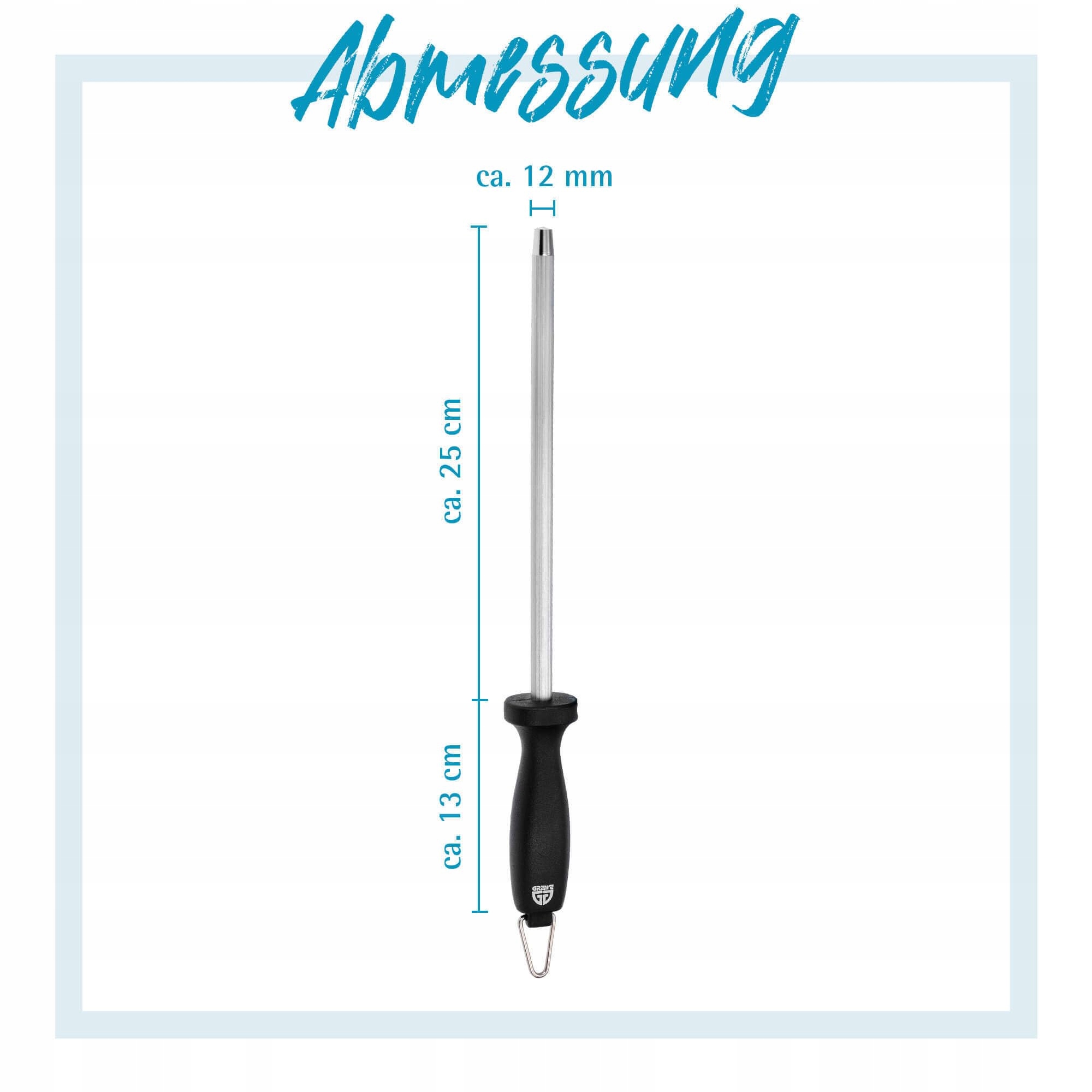 Praktyczne wymiary: Profesjonalna ostrzałka do noży GRÄWE ma całkowitą długość około 38 cm i długość ostrzenia około 25 cm przy średnicy około 12 mm. Z wagą około 300 g ten pręt do ostrzenia noży jest doskonale wyważony i zapewnia przyjemne użytkowanie podczas ostrzenia Twoich noży.