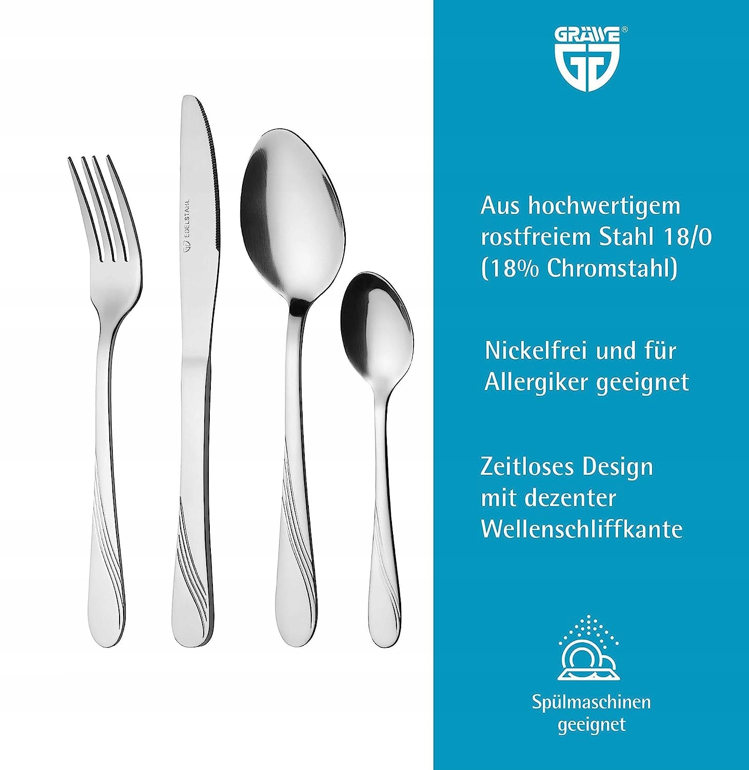 GRÄWE Zestaw sztućców dla 6 osób ze stali nierdzewnej, zestaw sztućców stołowych 24-częściowy, bez niklu, nierdzewny, ręcznie polerowany, nadający się do zmywarki - seria Stralsund