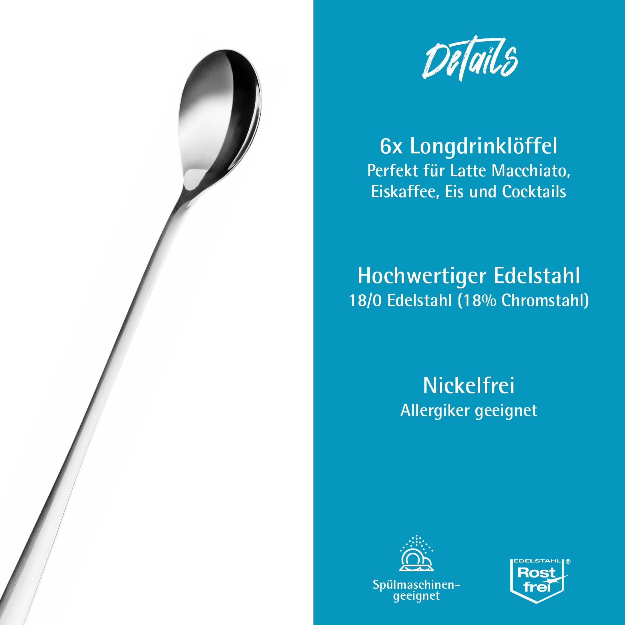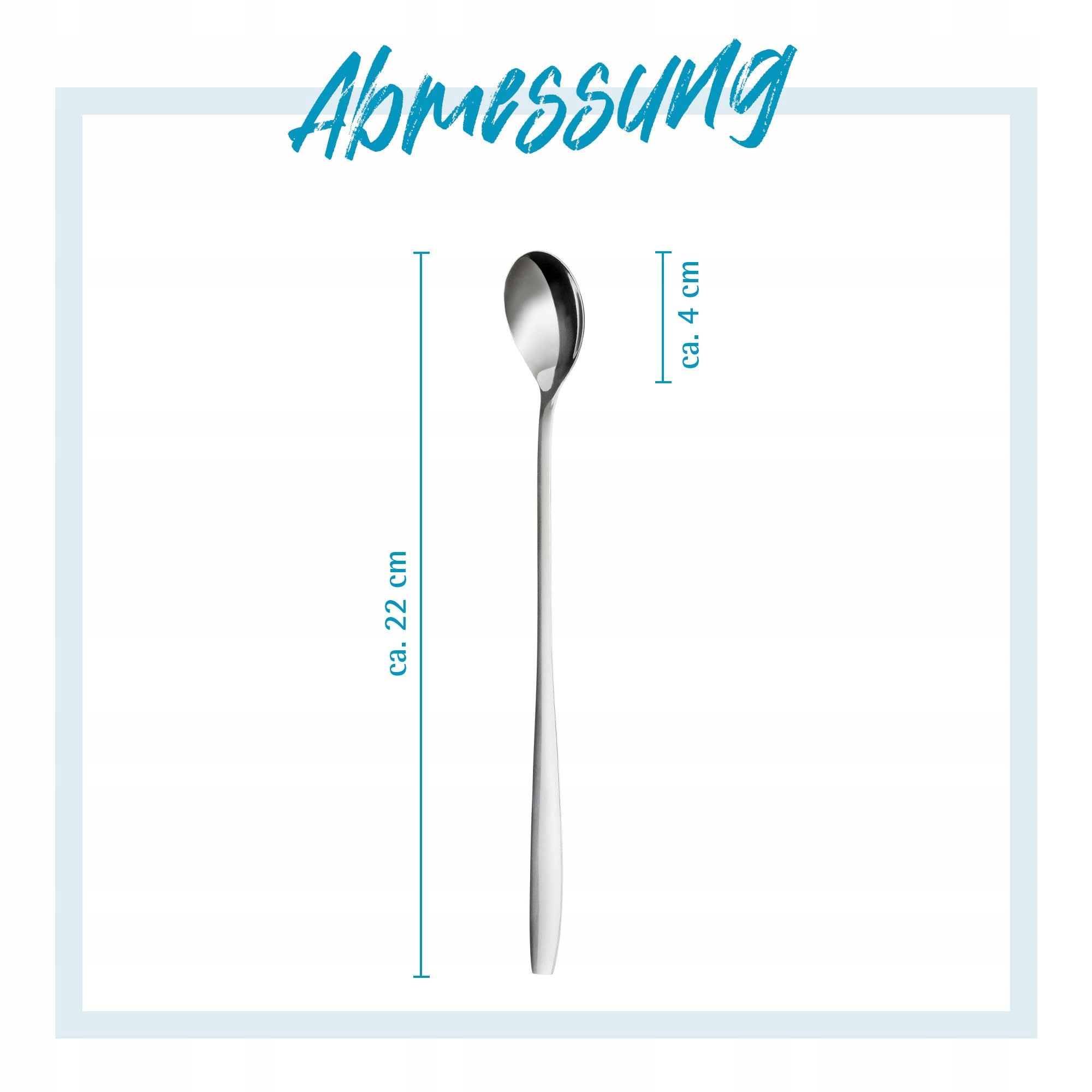 Idealna długość 22 cm do dużych szklanek i kubków Dzięki długości 22 cm te długie łyżeczki bez trudu sięgają dna wysokich szklanek. Idealne jako łyżeczki do lodów, latte macchiato lub koktajli. Dzięki praktycznemu zestawowi 6-częściowemu jesteś doskonale przygotowany, aby stylowo gościć przyjaciół i rodzinę oraz zrelaksować się przy każdej kreacji napojów.