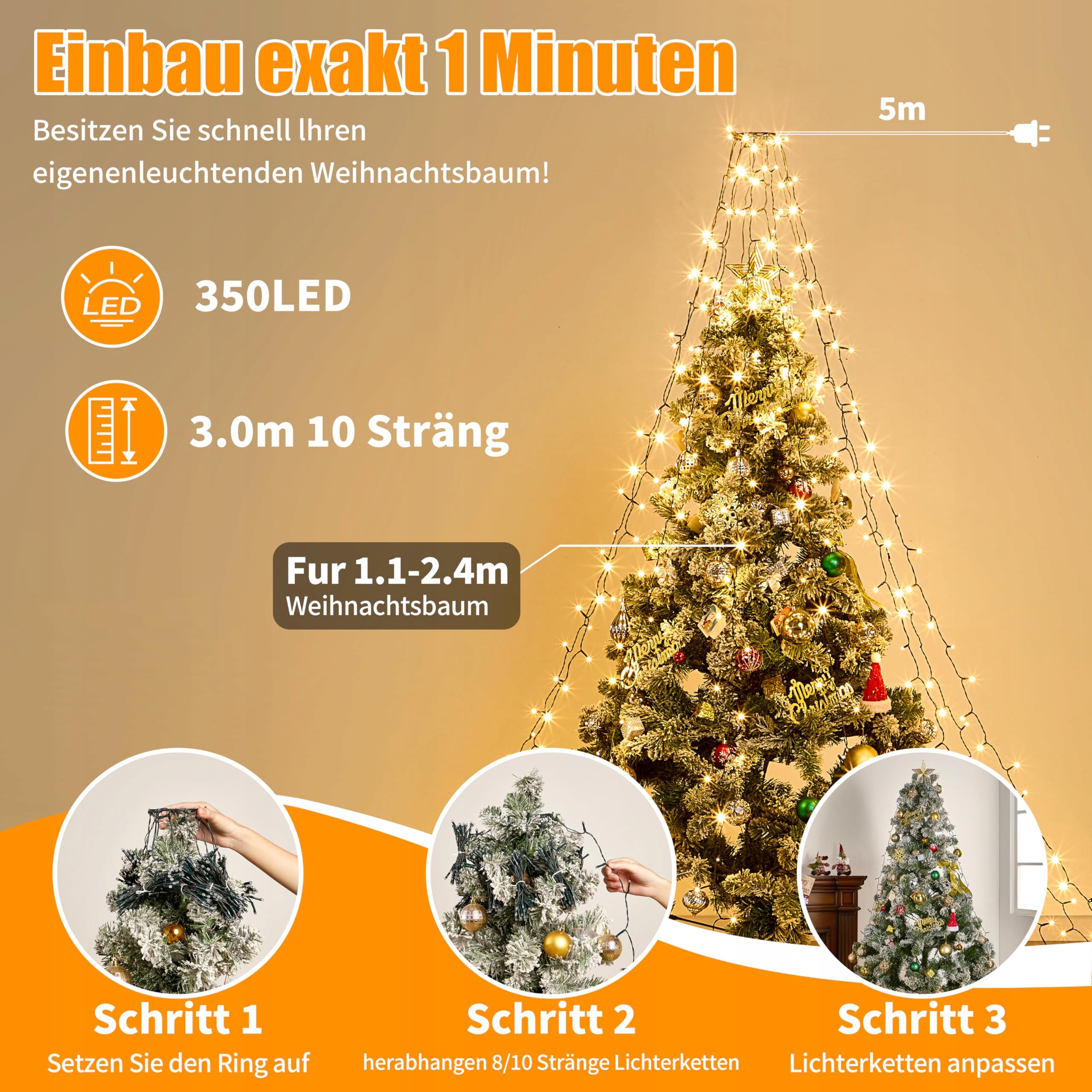 Gresonic-Led-Cluster-Lichterkette-Strombetrieb Deko für Innen Außen Garten Weihnachtsbaum Hochzeit (Ciepła biel Timer z pierścieniem, 350LED 10 sznurków)