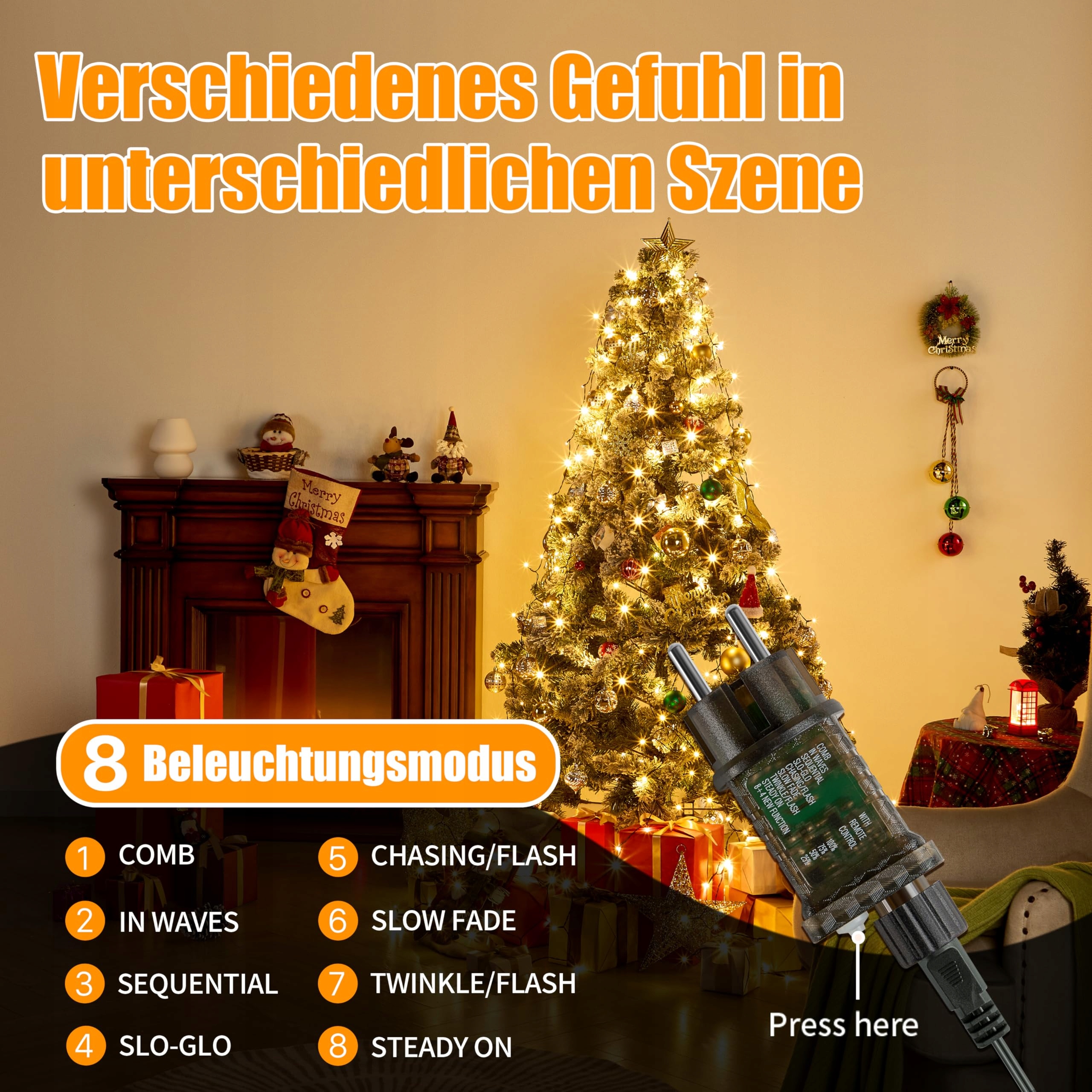 [8 różnych trybów]: Ciepła biel; kombinacja, fala, ciągłe świecenie, wolne rozjaśnianie, oświetlanie, wolne przygasanie, migotanie, świecenie. Odpowiednie do choinki na zewnątrz, dekoracji świątecznych na zewnątrz, lampek LED na choinkę, zewnętrznej łańcucha świateł choinkowych.