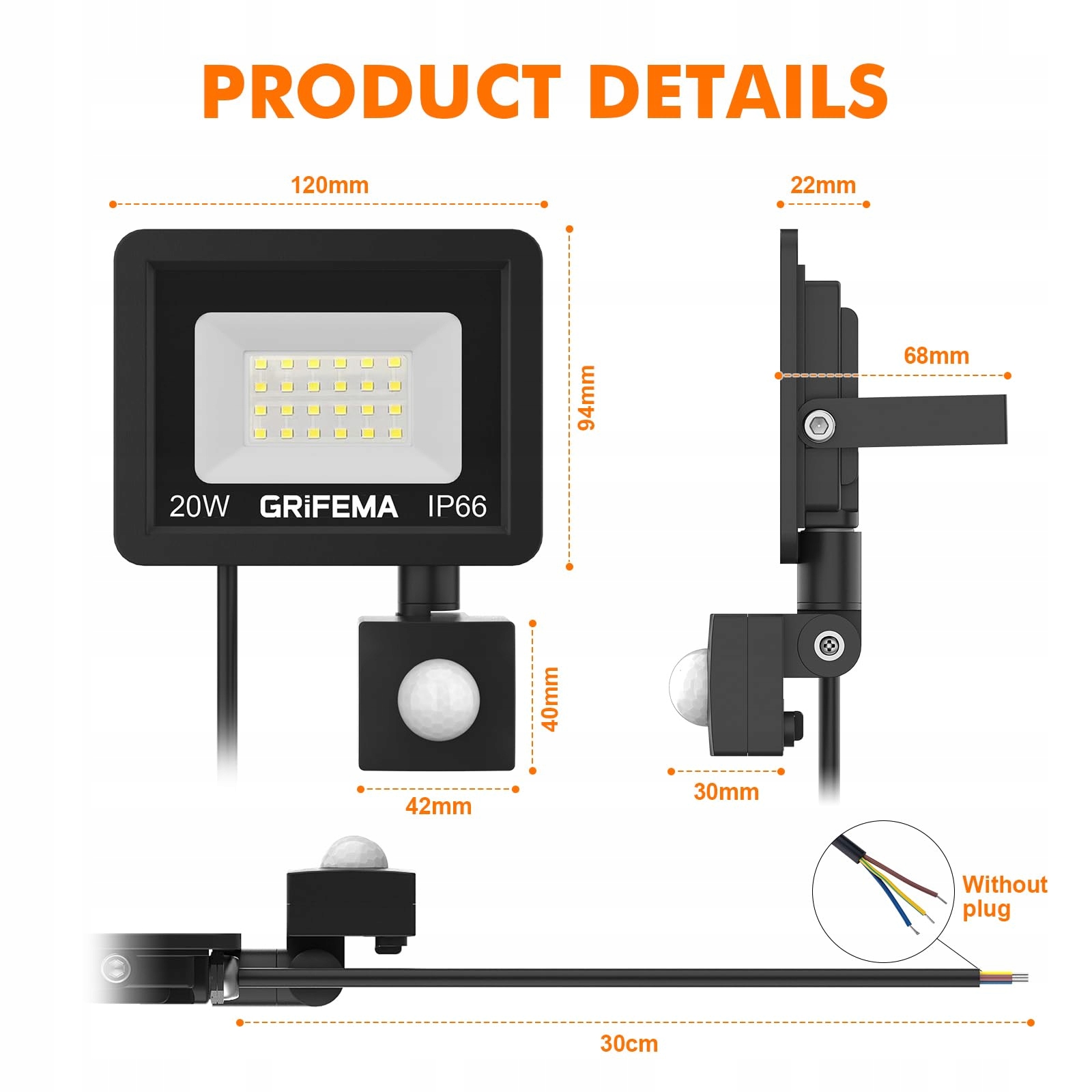 GRIFEMA 20W LED Reflektor Z Czujnikiem Ruchu 2200LM 6500K IP66 Do Ogrodu | Premium Supply