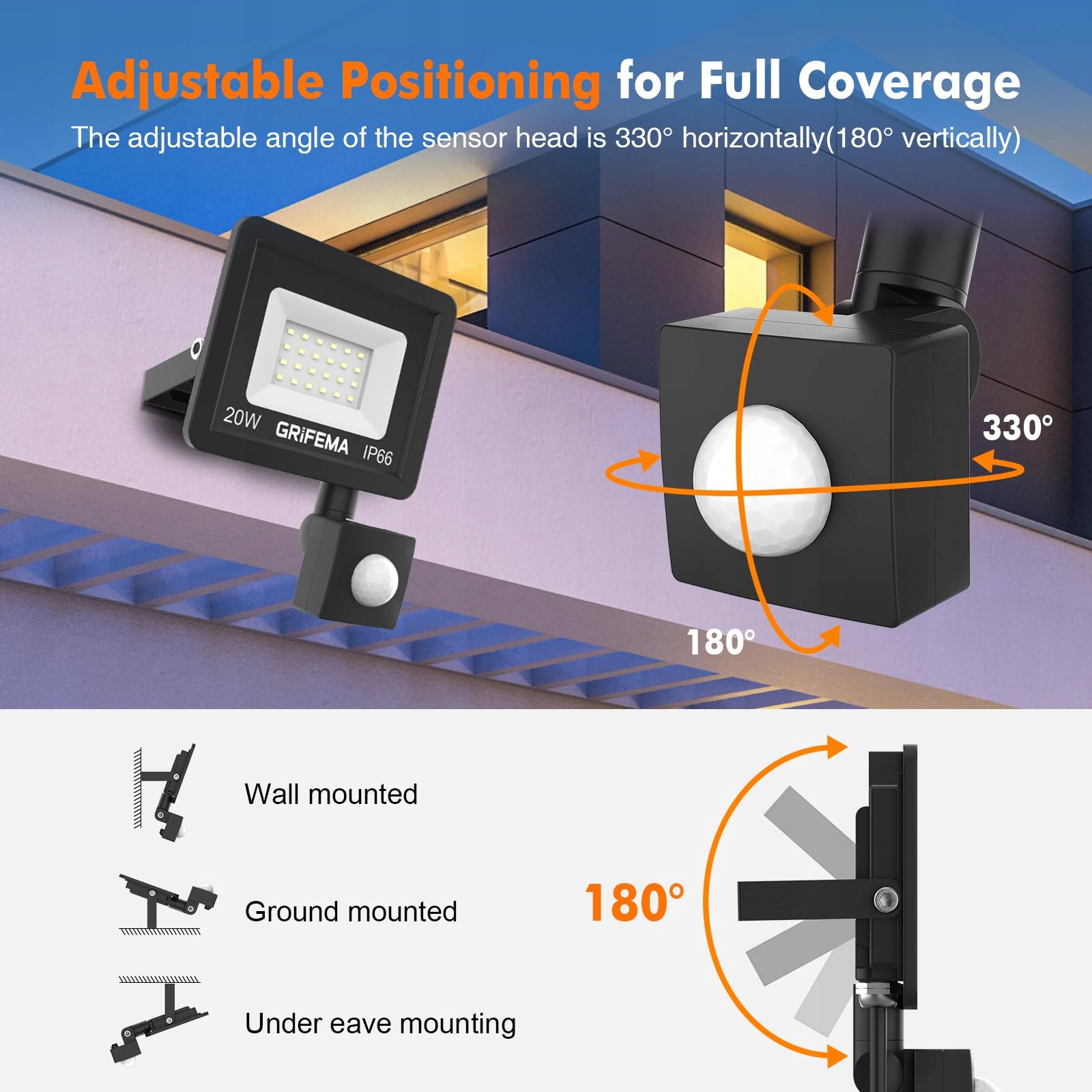 GRIFEMA 20W Reflektor LED z czujnikiem ruchu, 2200LM, 6500K zimna biel, IP66 wodoodporny, regulowany uchwyt 180° do ogrodu, garażu, podwórka, oświetlenia zewnętrznego, bez wtyczki