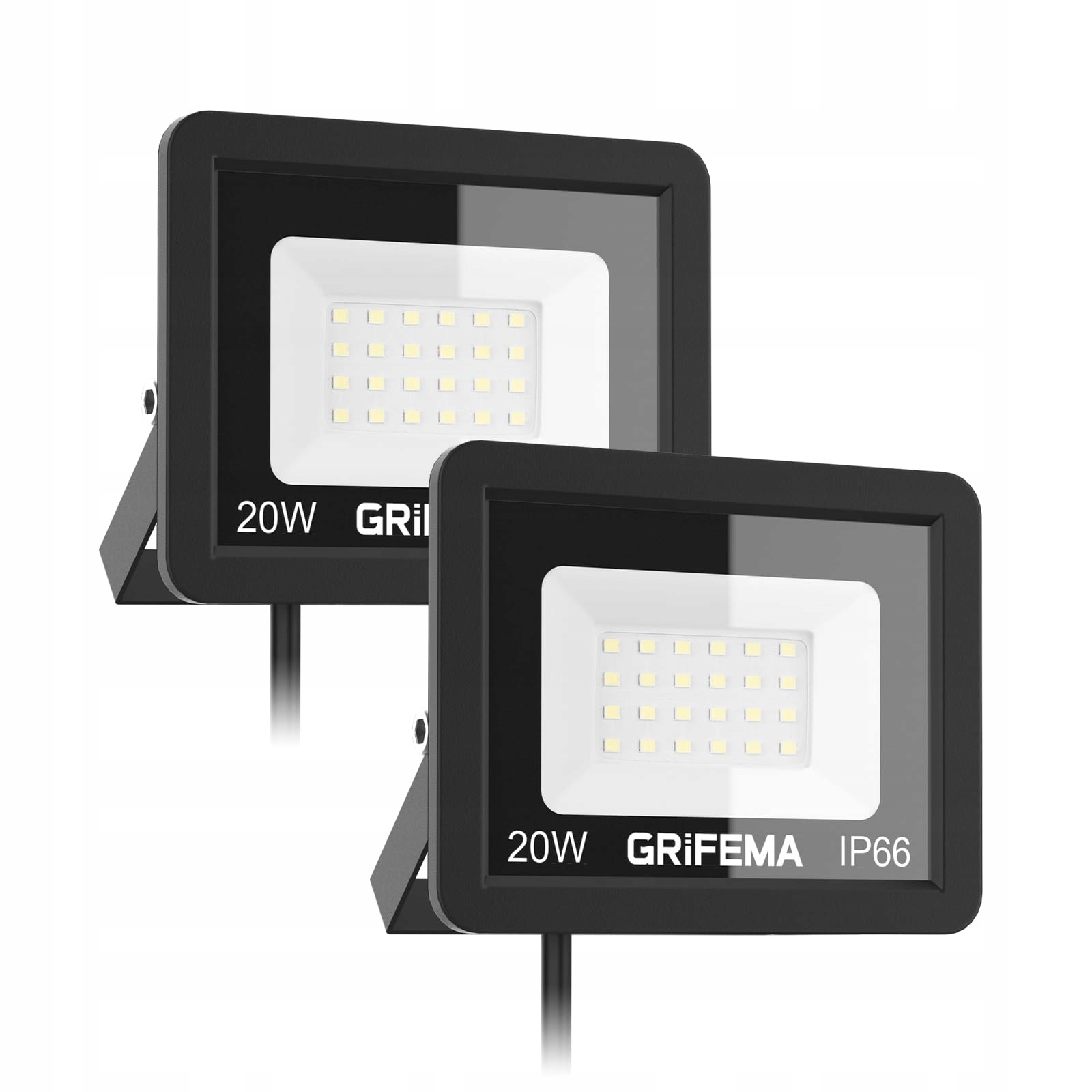 GRIFEMA 20W Reflektor LED na zewnątrz, [2 sztuki] 2200LM, 6500K zimna biel, wodoodporny IP66, regulowany uchwyt 180°, do ogrodu, garażu, podwórka, oświetlenie zewnętrzne, bez wtyczki, czarny