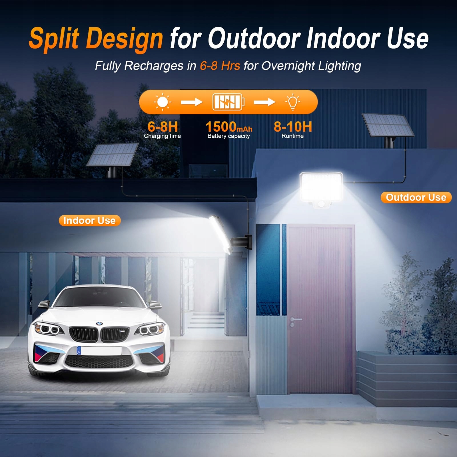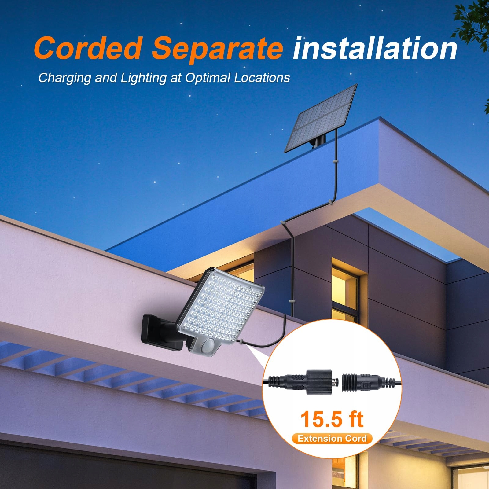 [Podzielona lampa ścienna z panelem solarnym]: Ogrodowe lampy solarne zasilane energią słoneczną i wodoodporne składają się z dwóch części: panelu słonecznego i lampy, z 5 m kablem. Wodoodporne lampy solarne do użytku zewnętrznego oferują większy wybór miejsc montażu, mogą być ładowane i działają prawidłowo nawet w deszczową pogodę lub zimą.