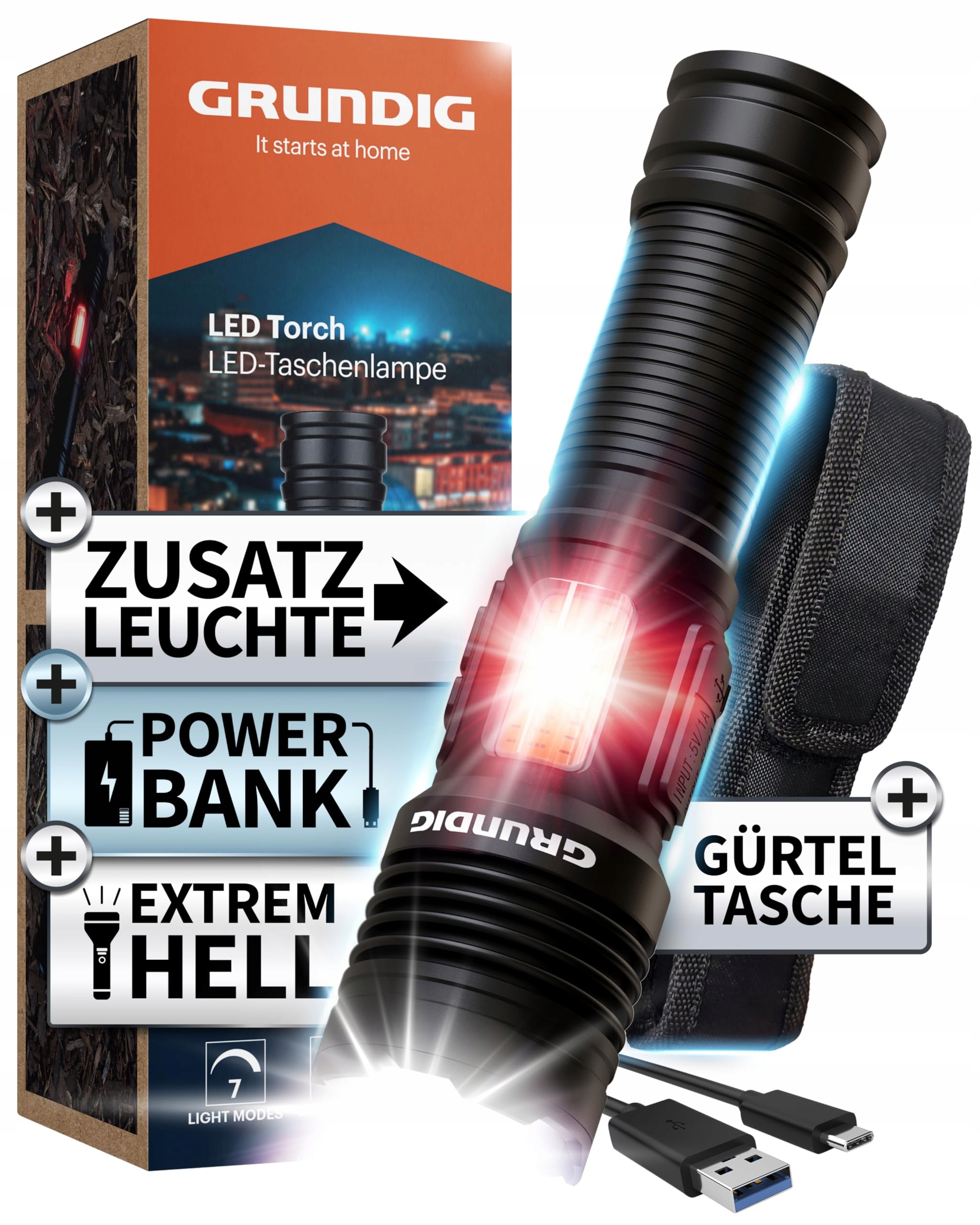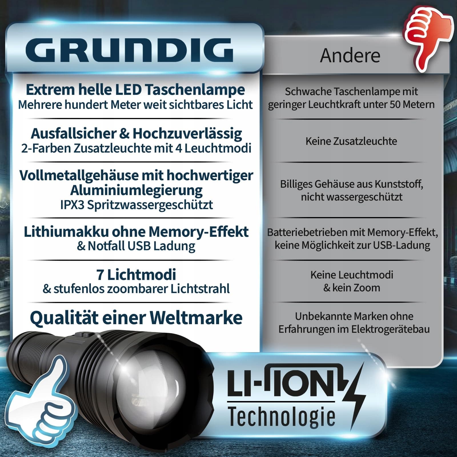 Latarka GRUNDIG LED ładowana - Ekstremalnie jasna - Technologia jonowa - Odporna na awarie z dodatkowym światłem roboczym - Awaryjne ładowanie USB telefonu/tabletu - wytrzymała obudowa aluminiowa - mocny akumulator Li