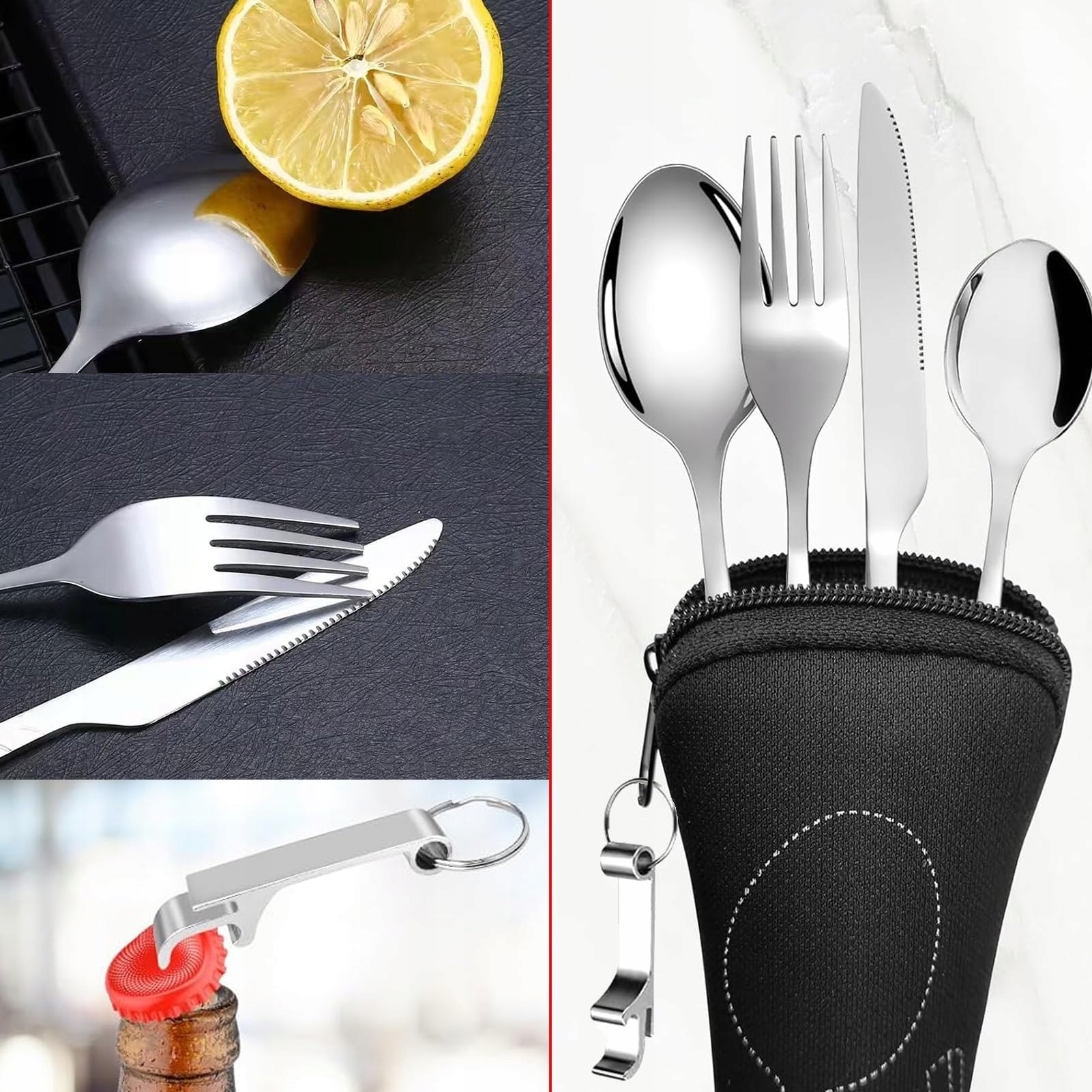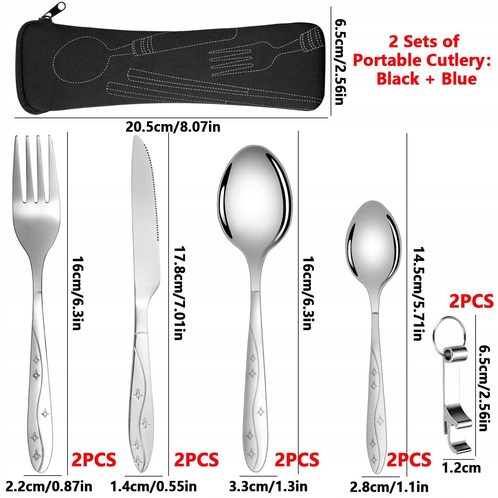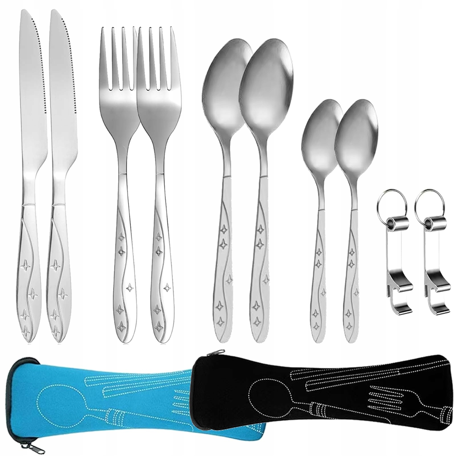 【Zestaw 12 sztućców campingowych】Ten zestaw sztućców ze stali nierdzewnej wystarcza dla 2 osób, każda porcja zawiera po 2 łyżki, 2 noże, 2 widelce, 2 łyżeczki do kawy, 2 otwieracze do wina oraz 2 etui na sztućce do użytku w podróży, łącznie 12 części