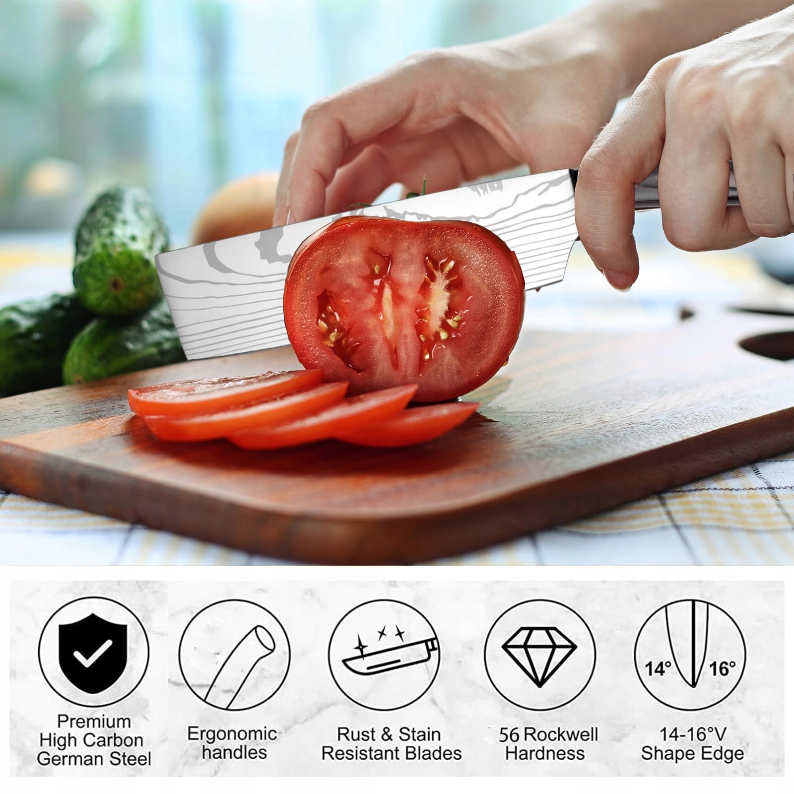 Precyzyjne krojenie: Każdy nóż jest starannie ostrzony ręcznie z kątem 14 stopni, co zapewnia wyjątkową ostrość i długotrwałą wydajność. Idealny do krojenia mięsa, siekania warzyw i kostkowania owoców, zaprojektowany z myślą o codziennym użytkowaniu. Uprość swoje zadania kuchenne i ciesz się efektywnym, precyzyjnym gotowaniem za każdym razem.