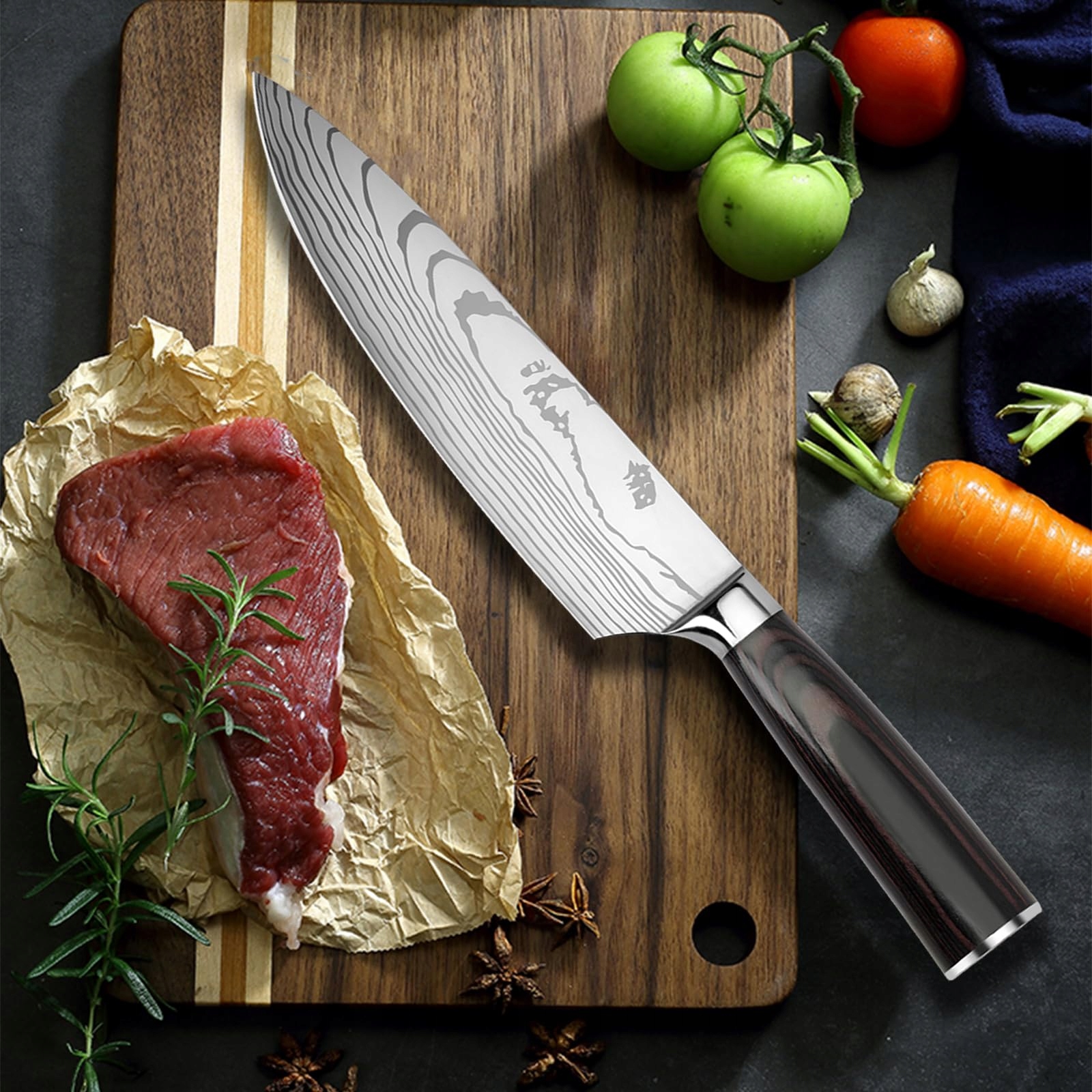 Super-premium stal: Noże kuchenne Gustrug są wykonane ze stali nierdzewnej o wysokiej zawartości węgla, która jest precyzyjnie kuta, poddawana obróbce cieplnej i ręcznie polerowana dla niezrównanej wydajności. Jest odporna na zużycie, wyginanie i odbarwienia, doskonała do krojenia, siekania i kostkowania, oferując wyjątkową trwałość i precyzję dla wszystkich Twoich potrzeb kuchennych.