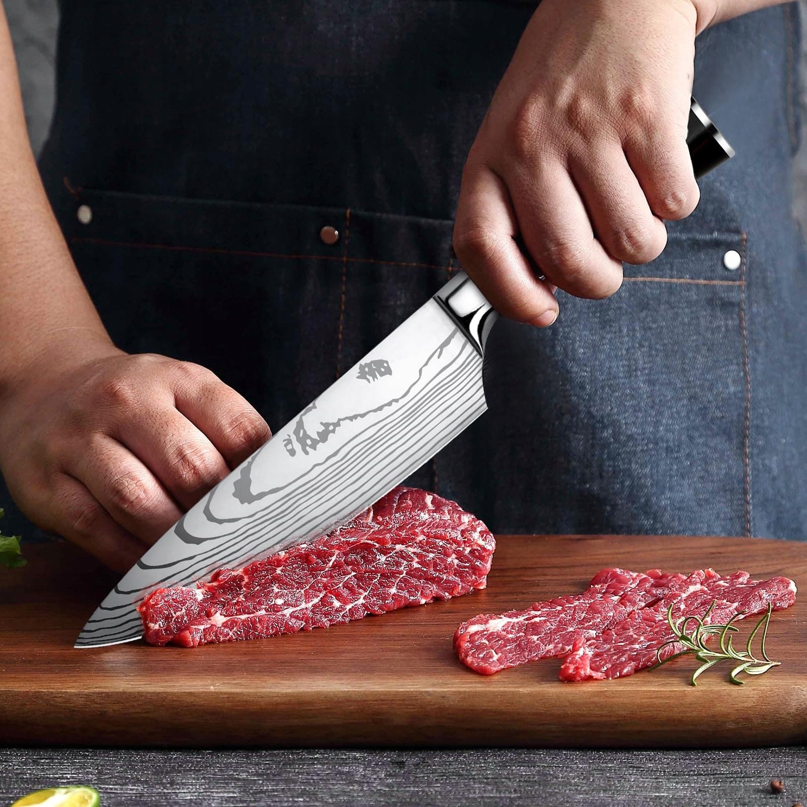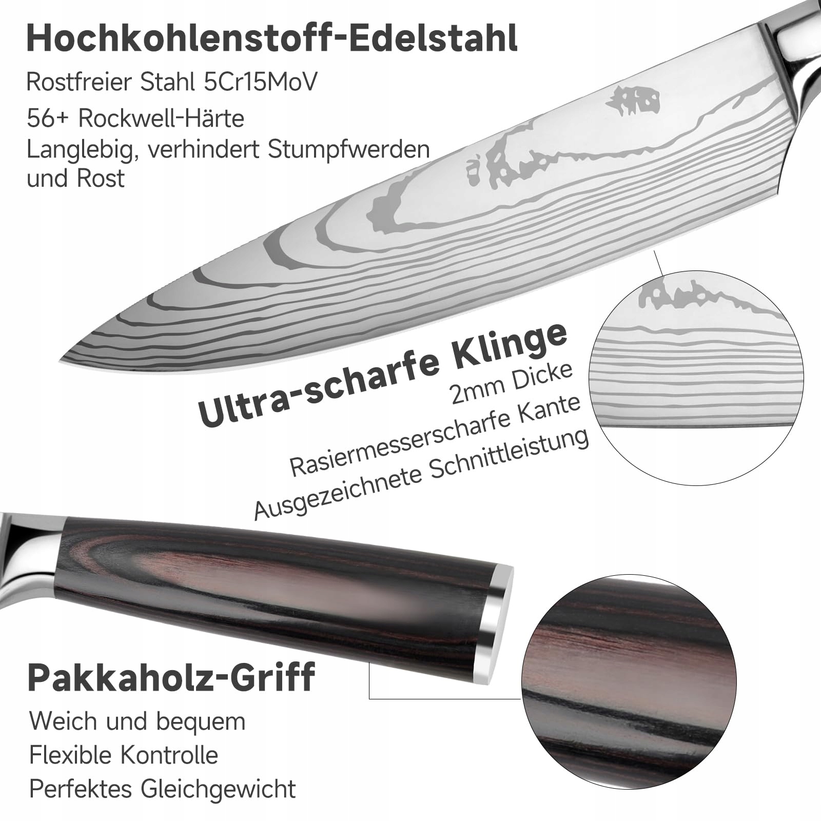 Ergonomiczny uchwyt: Uchwyt wykonany jest z drewna Pakkah. Oferuje miękkie i przyjemne uczucie w dłoni. Wbudowane ostrze jest zintegrowane z miękkim i wygodnym uchwytem, co zapewnia doskonały chwyt, minimalizując napięcie nadgarstka i zapewniając precyzyjną kontrolę podczas krojenia. Niezależnie od tego, czy jesteś profesjonalnym kucharzem, czy początkującym w kuchni, ten zestaw noży zapewnia komfortowe i przyjemne doświadczenie gotowania.