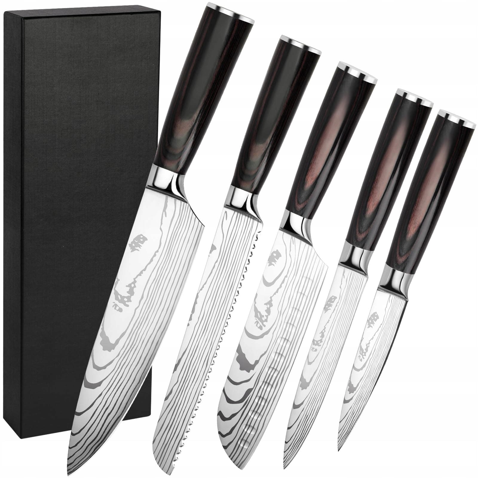 5-częściowy zestaw noży kuchennych z pudełkiem prezentowym: Zestaw noży zawiera 1 * nóż kuchenny, 1 * nóż do chleba, 1 * nóż Santoku, 1 * nóż uniwersalny, 1 * nóż do warzyw. Ten zestaw noży obejmuje różnorodne noże o różnych funkcjach, które nie tylko spełniają różnorodne potrzeby kuchenne, ale także są zapakowane w piękne pudełko prezentowe. Niezależnie od tego, czy jako prezent urodzinowy, ślubny czy bożonarodzeniowy, przyniesie on odbiorcy niespodziankę i radość.
