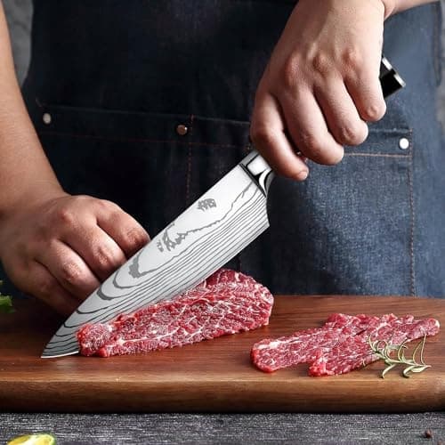 Ergonomicznie uformowany uchwyt: Uchwyt wykonany jest z drewna Pakkaholz. Oferuje miękkie i przyjemne uczucie w dłoni. Wbudowane ostrze jest zintegrowane z miękkim i wygodnym uchwytem, co zapewnia doskonały chwyt, minimalizując napięcie nadgarstka i zapewniając precyzyjną kontrolę podczas krojenia. Niezależnie od tego, czy jesteś profesjonalnym kucharzem, czy początkującym w kuchni, ten zestaw noży zapewnia komfortowe i przyjemne doświadczenie gotowania.